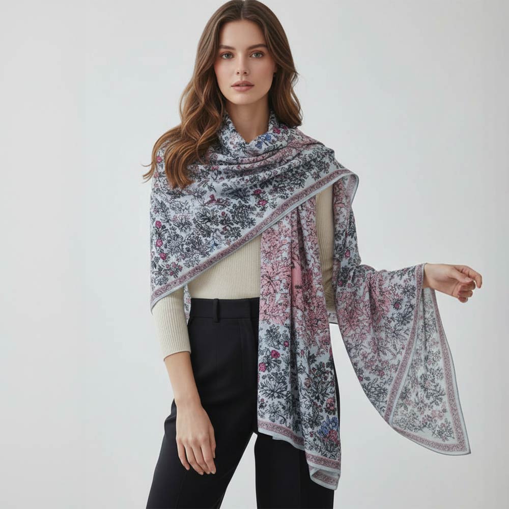 Details • Size : 35" X 78" • Material : 100% Viscose • Breathable, Lightweight, Skin-friendly and Soft • This vintage botanical square scarf features an intricate floral pattern with a classic balanced layout. Designed for versatile styling, it can be worn around the neck, hair, handbag, or shoulders. A timeless accessory ideal for boutiques, gifting, seasonal collections, and everyday outfits with an elegant touch.