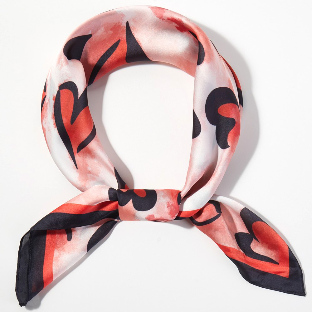Details • Size : 27.5" X 27.5" • Material : 100% Polyester • Trendy square scarf featuring an artistic watercolor heart pattern with a bold border design. Perfect for styling on the neck, hair, wrist, or handbag. A fashionable accessory ideal for Valentine’s themes, gift assortments, boutique displays, and everyday statement looks.