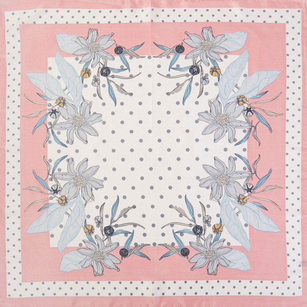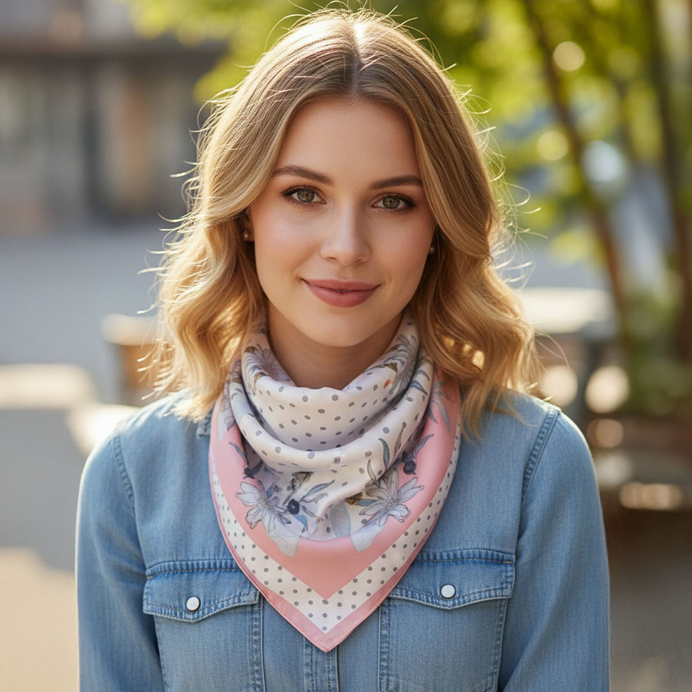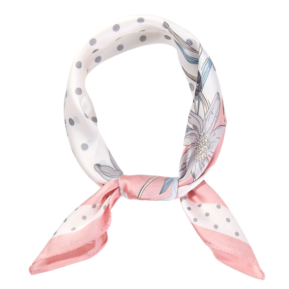 • Elegant square fashion scarf featuring a floral border with classic polka dot detailing. Designed for versatile styling around the neck, hair, handbag, or wrist, this timeless accessory adds a refined, feminine accent to everyday looks, seasonal outfits, and curated boutique collections.