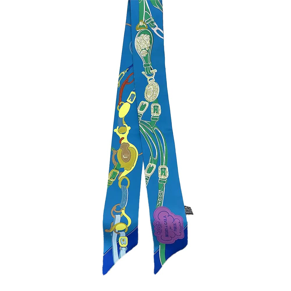 • This equestrian-inspired twilly scarf features a refined saddle and buckle motif designed for versatile styling. Perfect for wrapping around handbags, wrists, ponytails, or necks, it adds a polished accent ideal for everyday wear, gifting, and boutique displays.