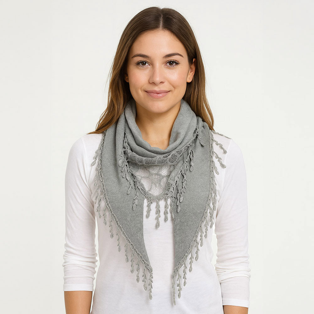 • This chic triangular scarf is adorned with intricate fringe detailing that adds movement and charm to any look. Lightweight yet stylish, it’s perfect for layering across seasons, offering versatile wear as a neck accessory, shoulder wrap, or statement accent.