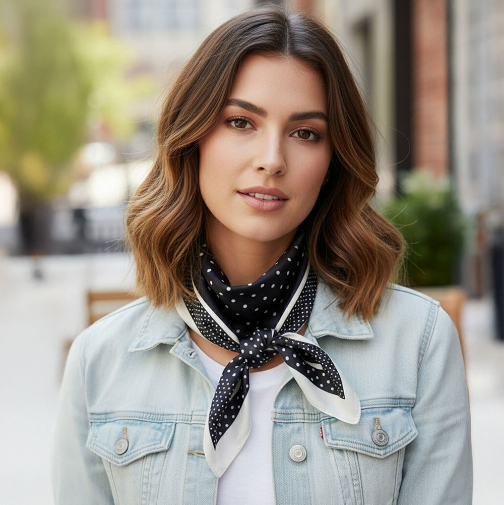 Details • Size : 27.5" X 27.5" • Material : 100% Polyester • Classic polka dot square scarf designed for effortless styling around the neck, hair, handbag, or wrist. A versatile fashion accessory that adds a timeless, retro-inspired accent to everyday outfits, seasonal wardrobes, and boutique collections with easy mix-and-match appeal.