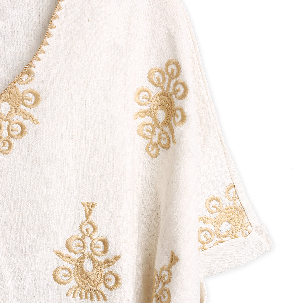 Details • Size : S/M, M/L • Material : 70% Linen, 30% Cotton • Elegant beige embroidered linen-cotton blend blouse with short sleeves and intricate golden patterns. A breathable, stylish top perfect for spring and summer casual or boho-chic looks.