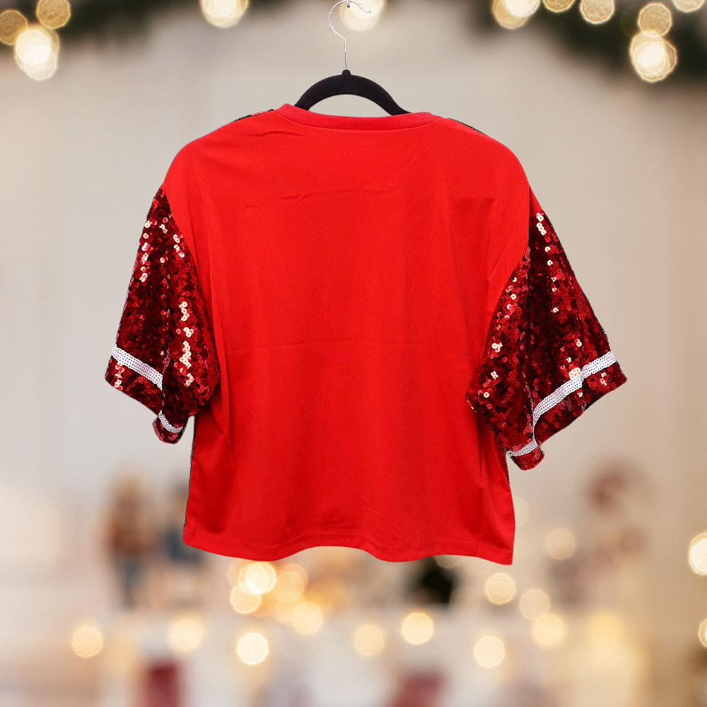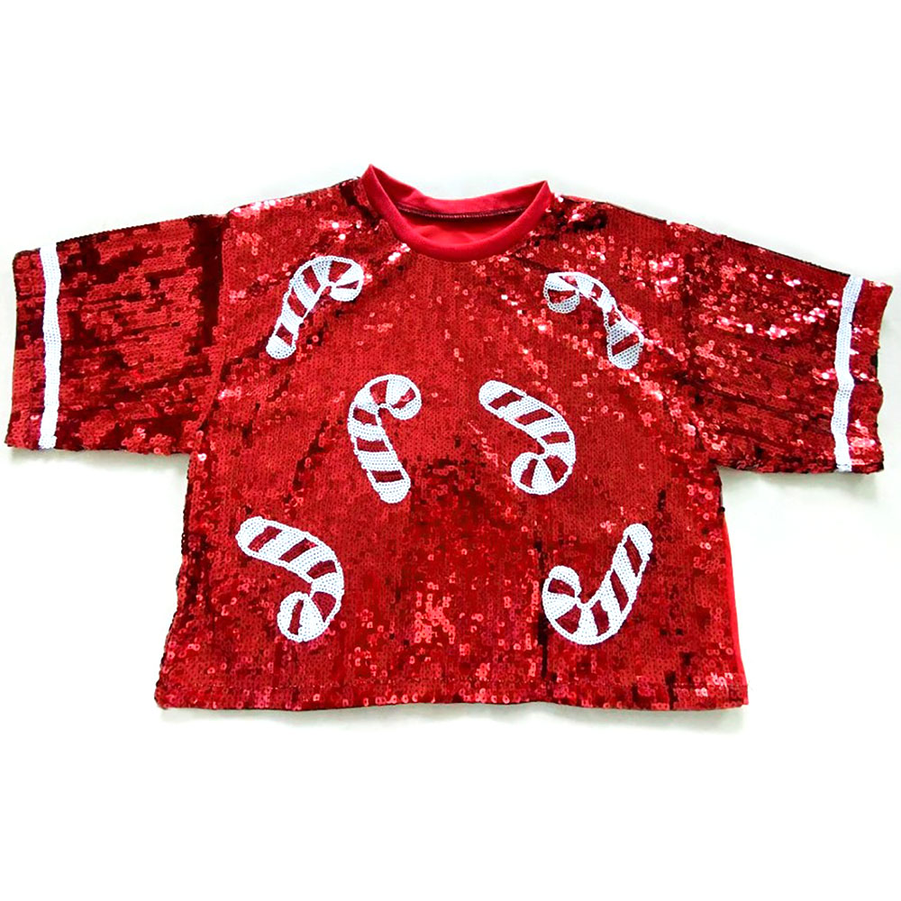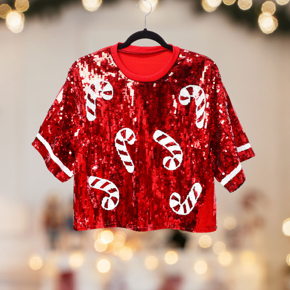 Details • Size : One Size • Bust Size : 42" - 45" L, Length : 21" L • Material : 100% Polyester • Spread holiday cheer with this sequin candy cane top, featuring a sparkling festive design perfect for the season. Ideal for Christmas parties, family gatherings, or cozy celebrations, this eye-catching shirt adds a fun and joyful touch to your holiday wardrobe.