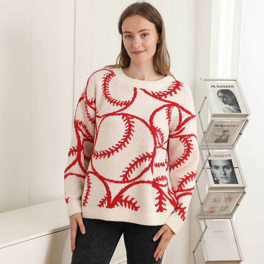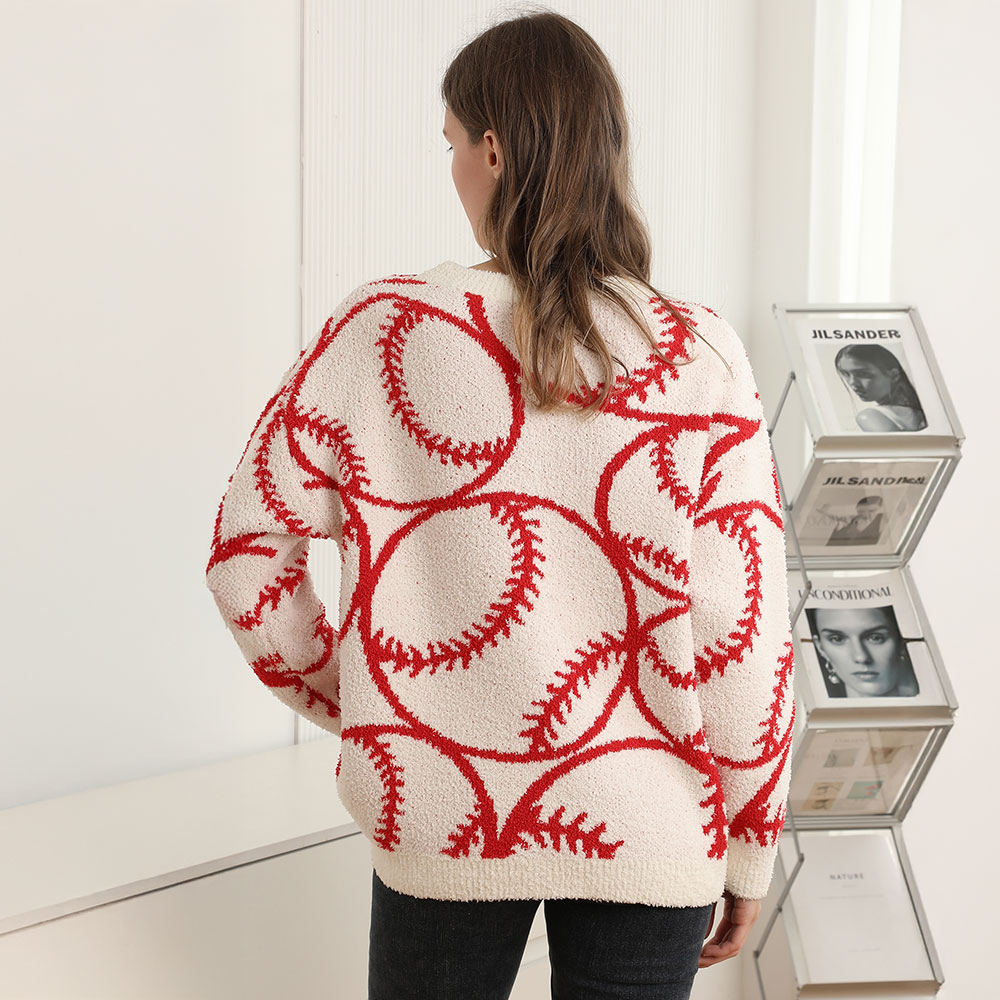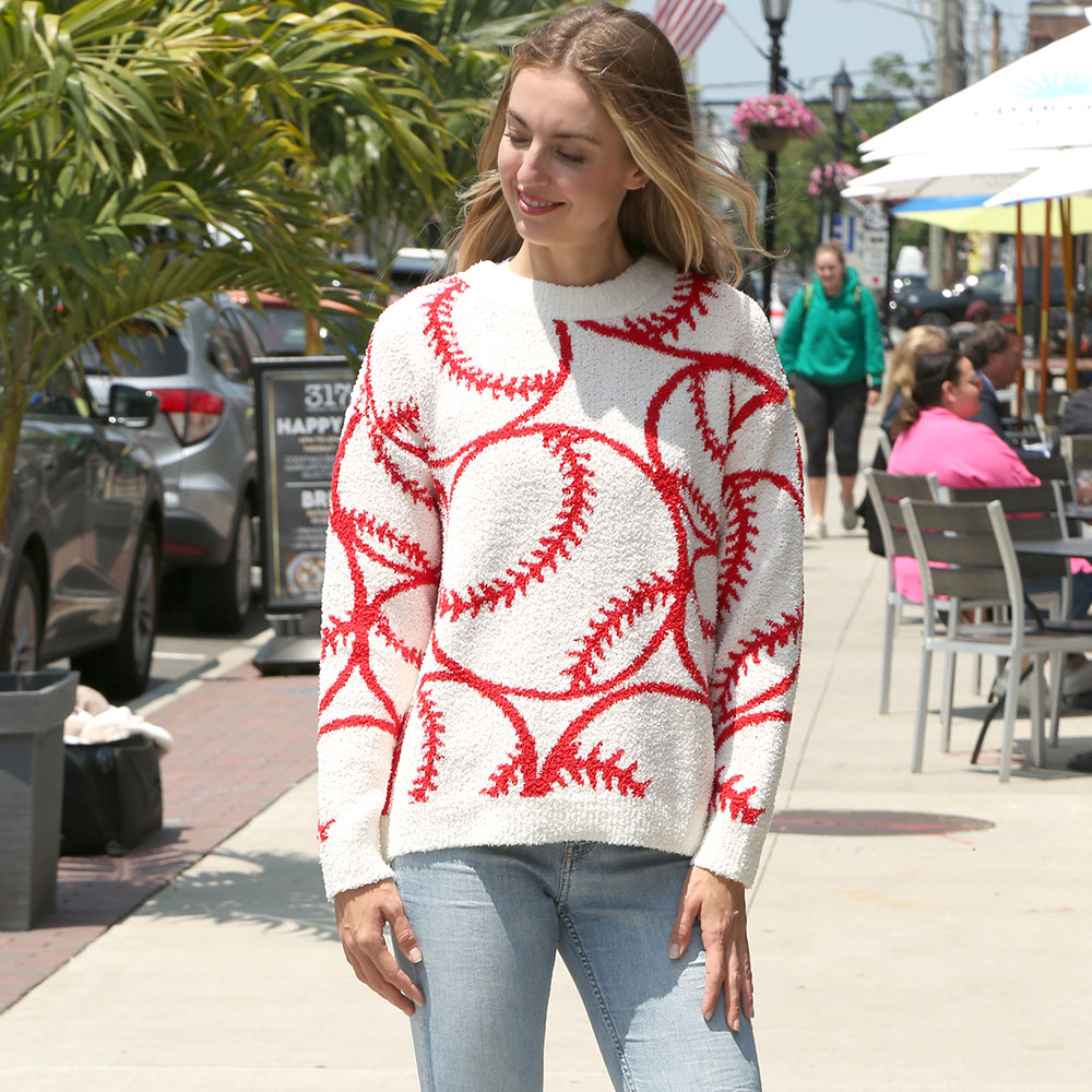 • Sporty baseball-inspired knit sweater with bold red stitch pattern. Comfortable, relaxed fit perfect for game days, casual wear, or athleisure looks.
