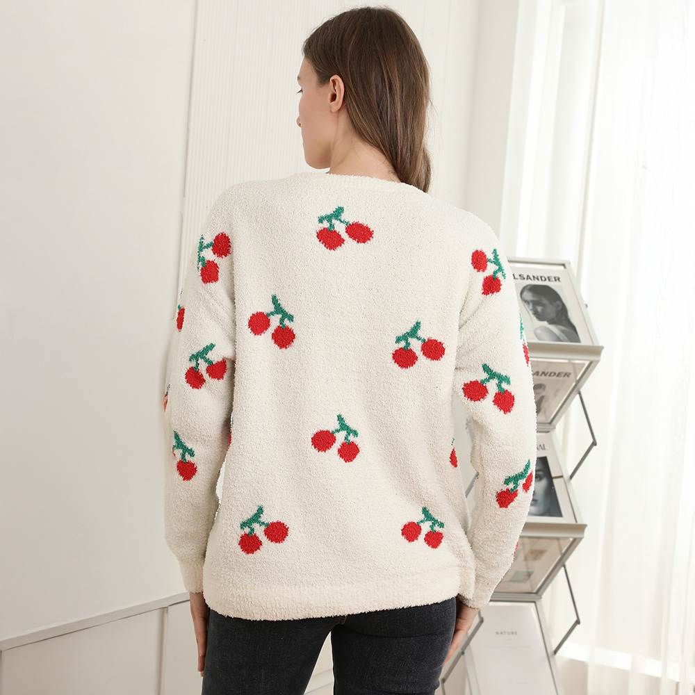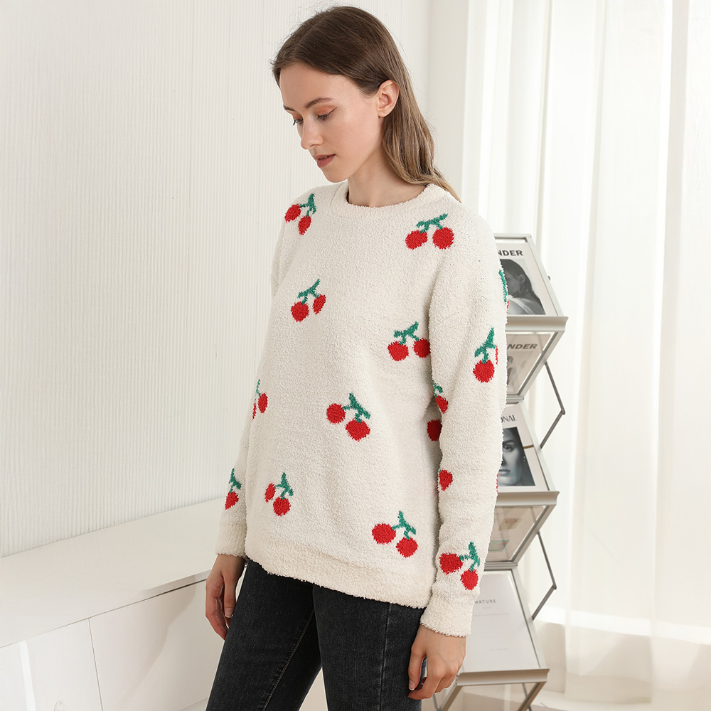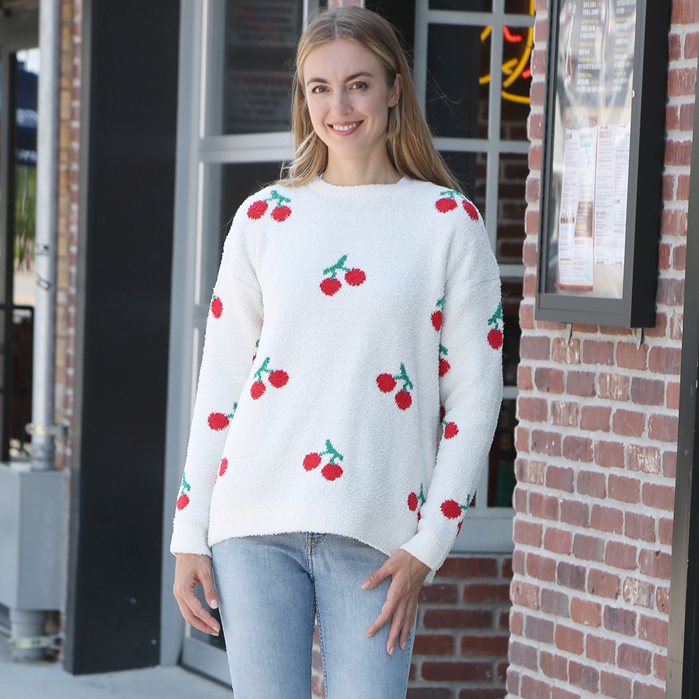 Details • Size : One Size • Material : 100% Poly.Microfiber • Add a playful twist to your loungewear with this cherry pattern knit pullover. Designed with a relaxed fit, soft textured fabric, and cheerful allover motif, it offers both comfort and charm—perfect for layering, lounging, or brightening up everyday casual looks.