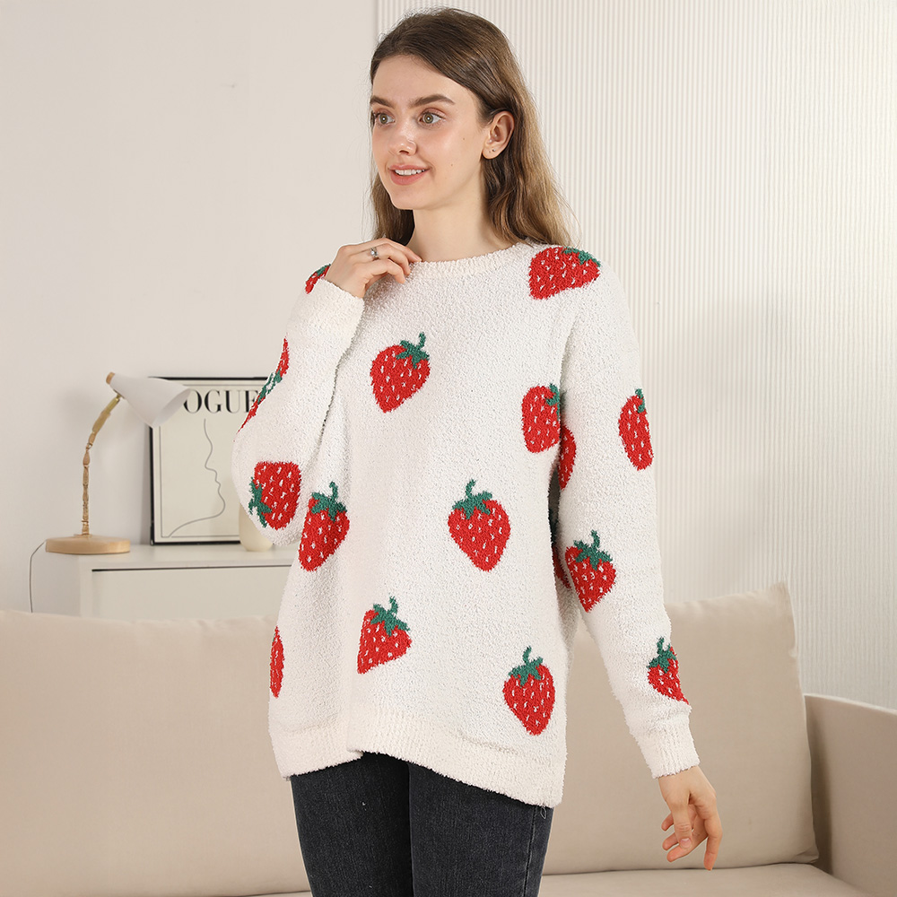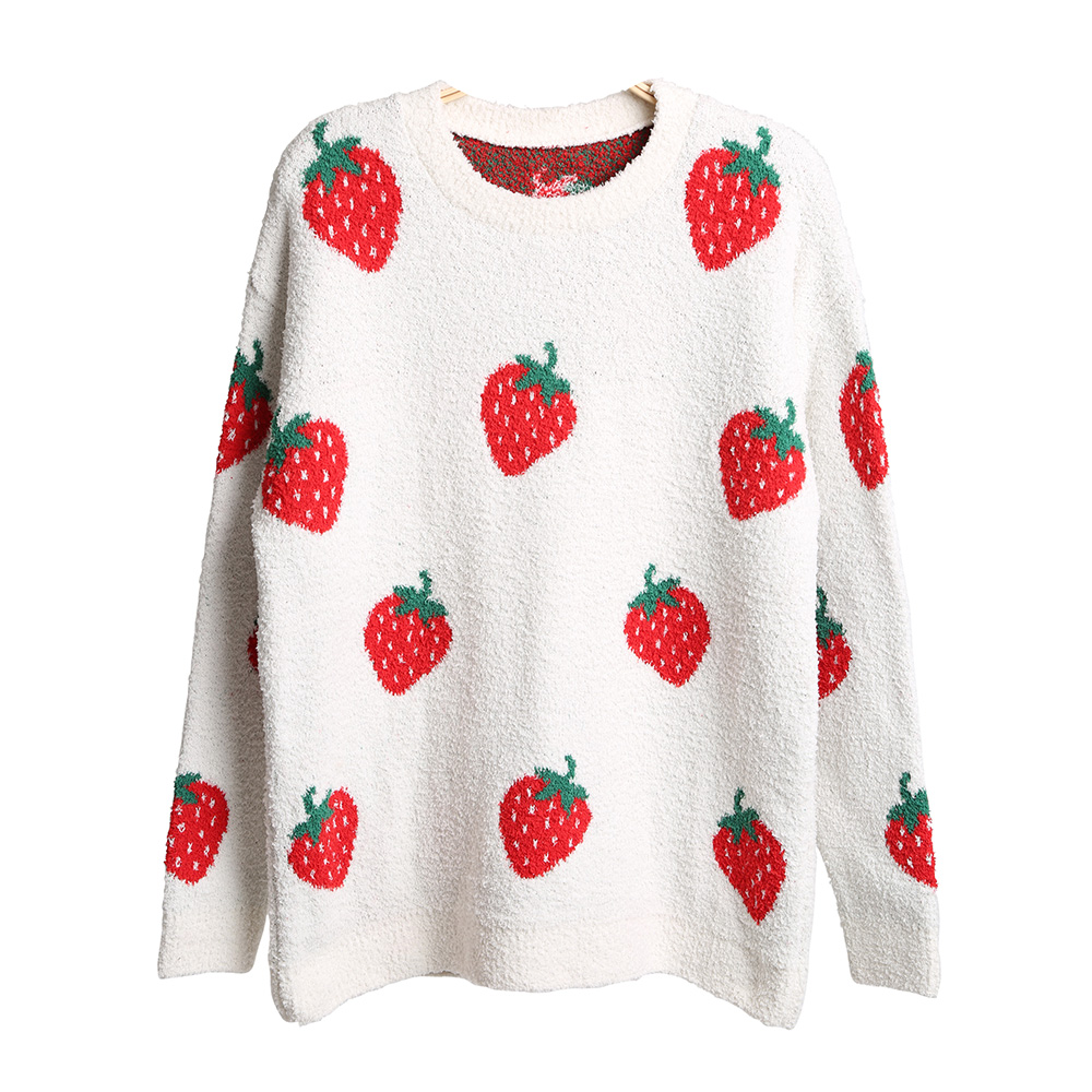 Details • Size : One Size • Material : 100% Poly.Microfiber • Bring sweetness to your wardrobe with this strawberry pattern knit pullover. Featuring a relaxed silhouette, soft textured knit, and playful allover fruit design, it blends comfort with charm—ideal for lounging, layering, or adding a fun touch to casual everyday looks.