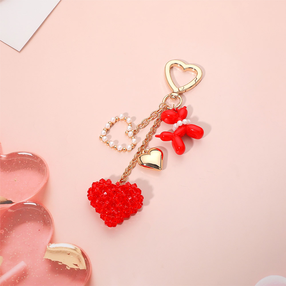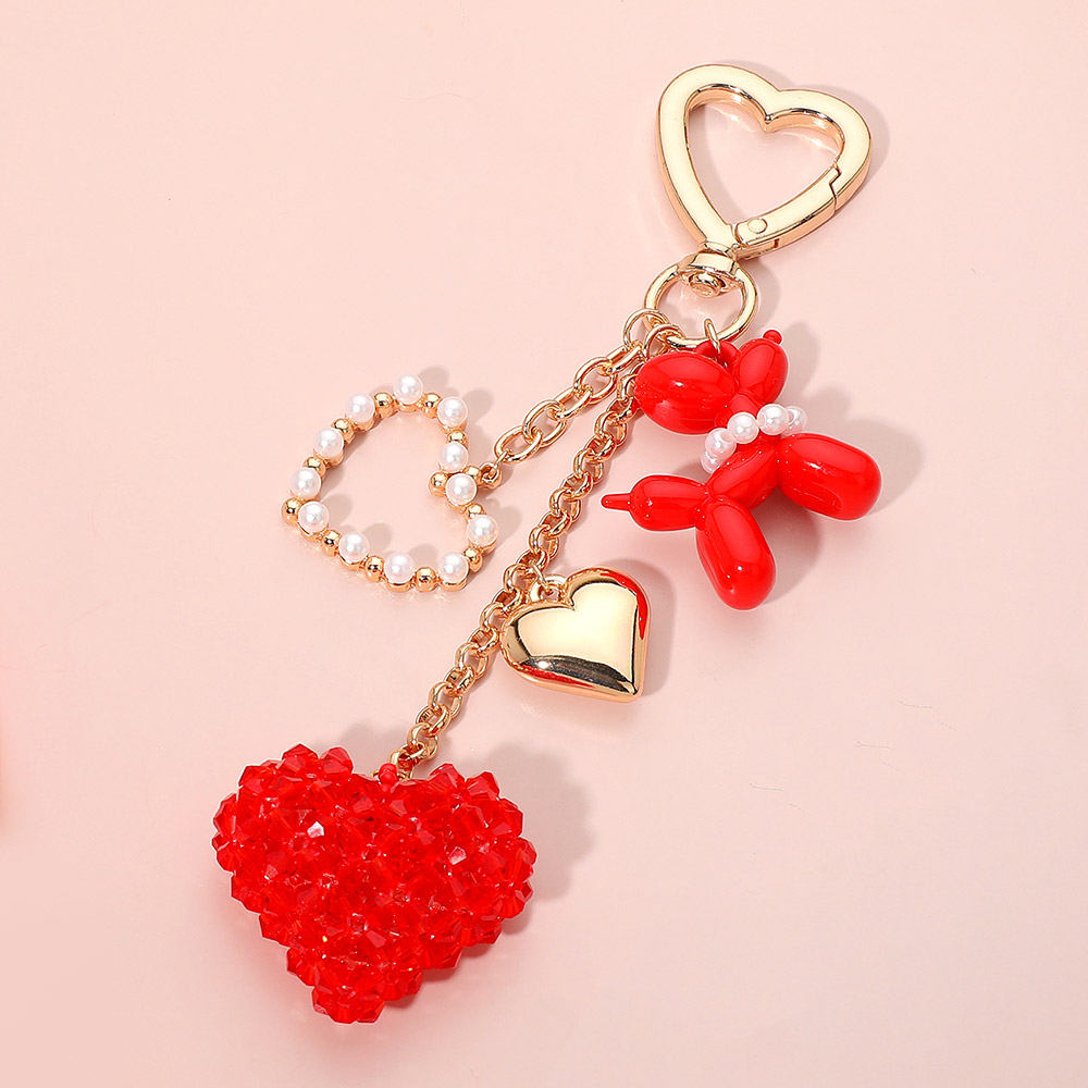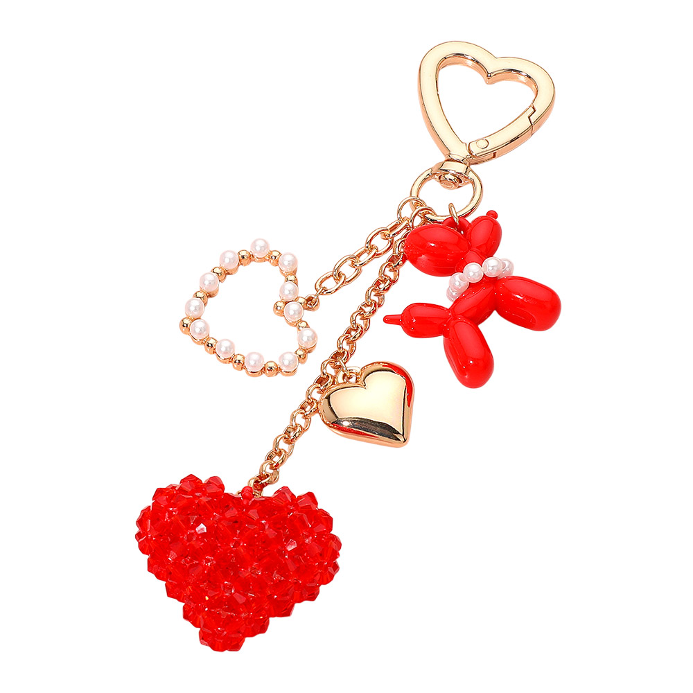 Details • Size : 1.5" X 6" • Playful keychain featuring a large faceted heart charm, balloon-dog accent, pearl heart frame and mini heart pendant. Designed with a heart-shaped clasp and layered chain drops, this cheerful accessory adds personality to bags, keys or gifts with its fun, lovable theme. • Lead and Nickel Compliant
