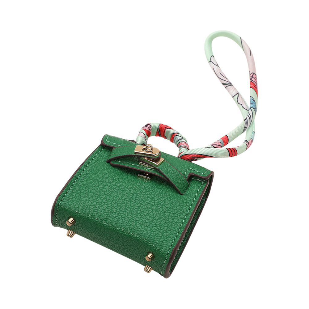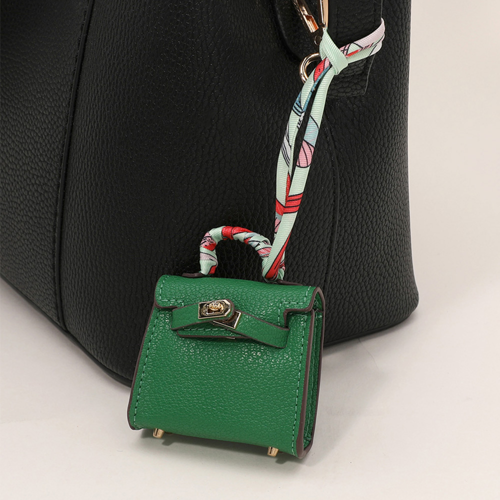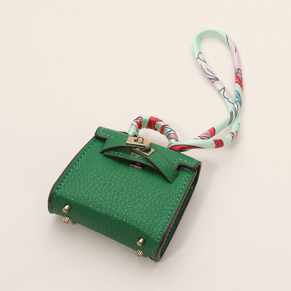 Details • Size : 2.2" X 2.6" X 1" • Top Handle Size : 0.75" L • Strap Size : 2" L / Detachable, Fabric scarf-style strap for easy attachment • Miniature handbag-style lock closure • Decorative metal rivets and clasp hardware detail • fits Earphone, Earbuds, Small Accessory • Can be used as a keychain, bag charm, or collectible accessory • Material : 100% Polyurethane