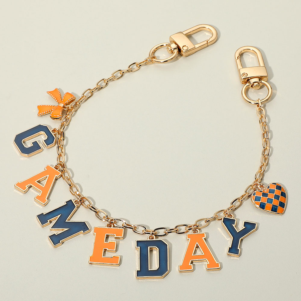 Details • Size : 14" L • Charm Size : 1.2" L • Fun and sporty bag charm featuring "Game Day" letter charms, a mini bow, and a heart accent. Perfect accessory to show team spirit by clipping onto purses, backpacks, or game-day totes. • Lead and Nickel Compliant
