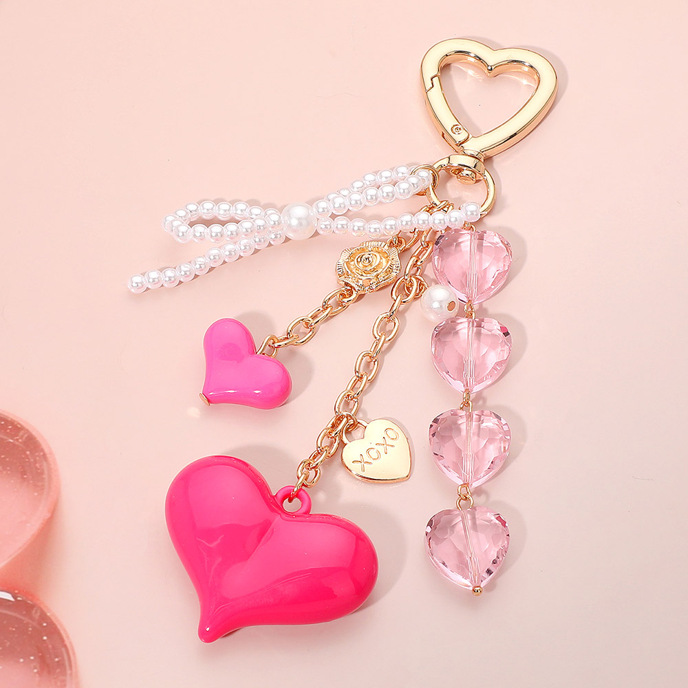 Details • Size : 1.75" X 6" • Cute heart charm keychain featuring a large glossy heart, mini heart accents, pearl bow detail and dangling heart beads. A playful accessory that adds charm to bags or keys, with mixed textures and layered charms for a fun, stylish look. Perfect for gifting or everyday use. • Lead and Nickel Compliant