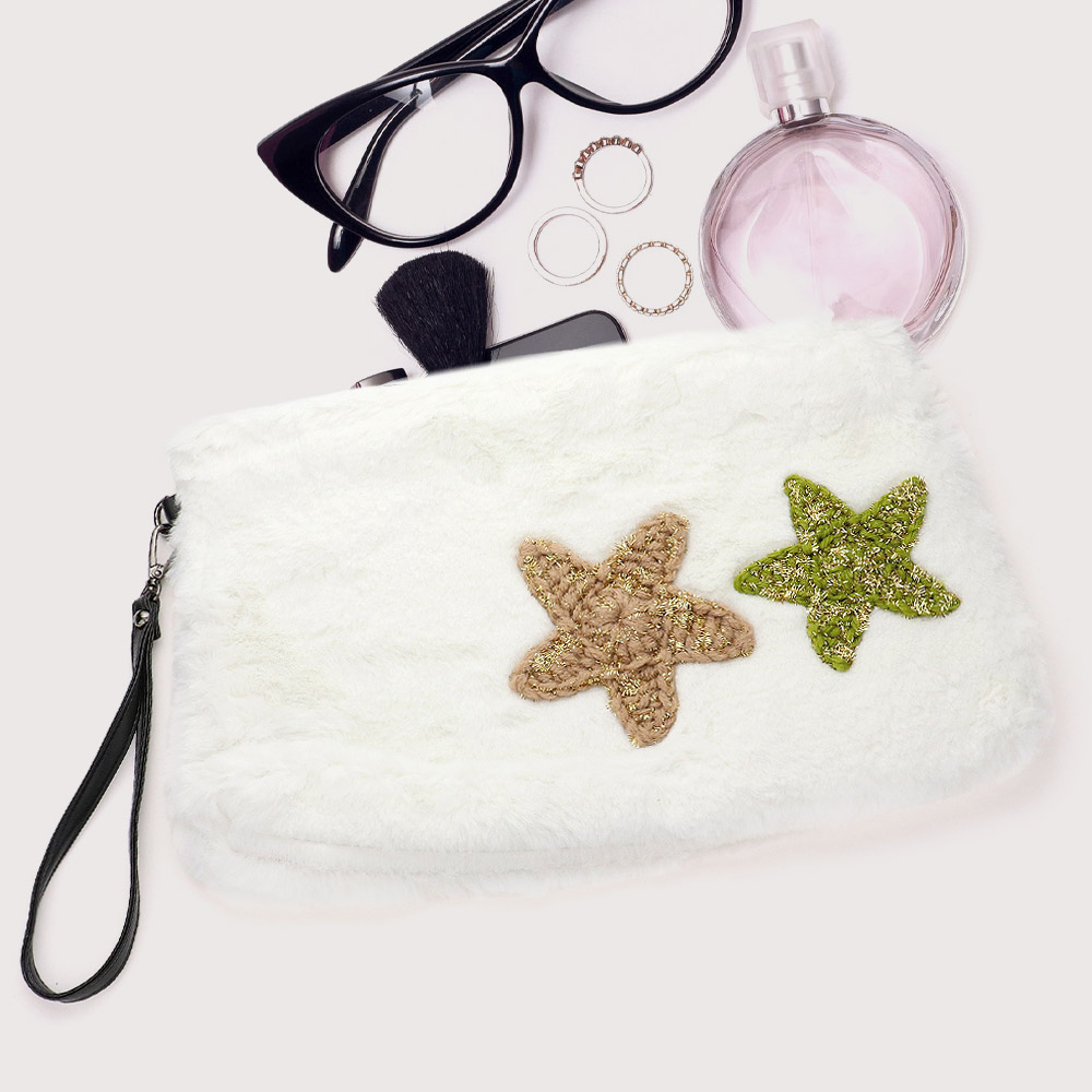Star Patches Fuzzy Faux Fur Wristlet Clutch Bag