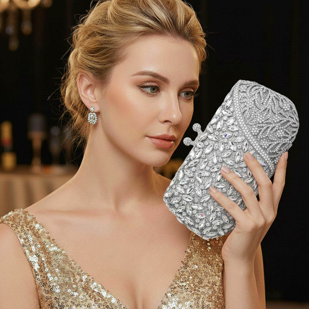 Details • Size : 8" X 4" X 1.75" • Strap Size : 21" L / Detachable • Clasp Closure • Turn heads with this leaf crystal frame evening clutch bag featuring an intricate faceted exterior, sculpted silhouette, and secure clasp design with chain strap for versatile wear. Ideal for weddings, parties, and formal events, it holds essentials in glamorous style while adding standout sparkle to any outfit or gift occasion.