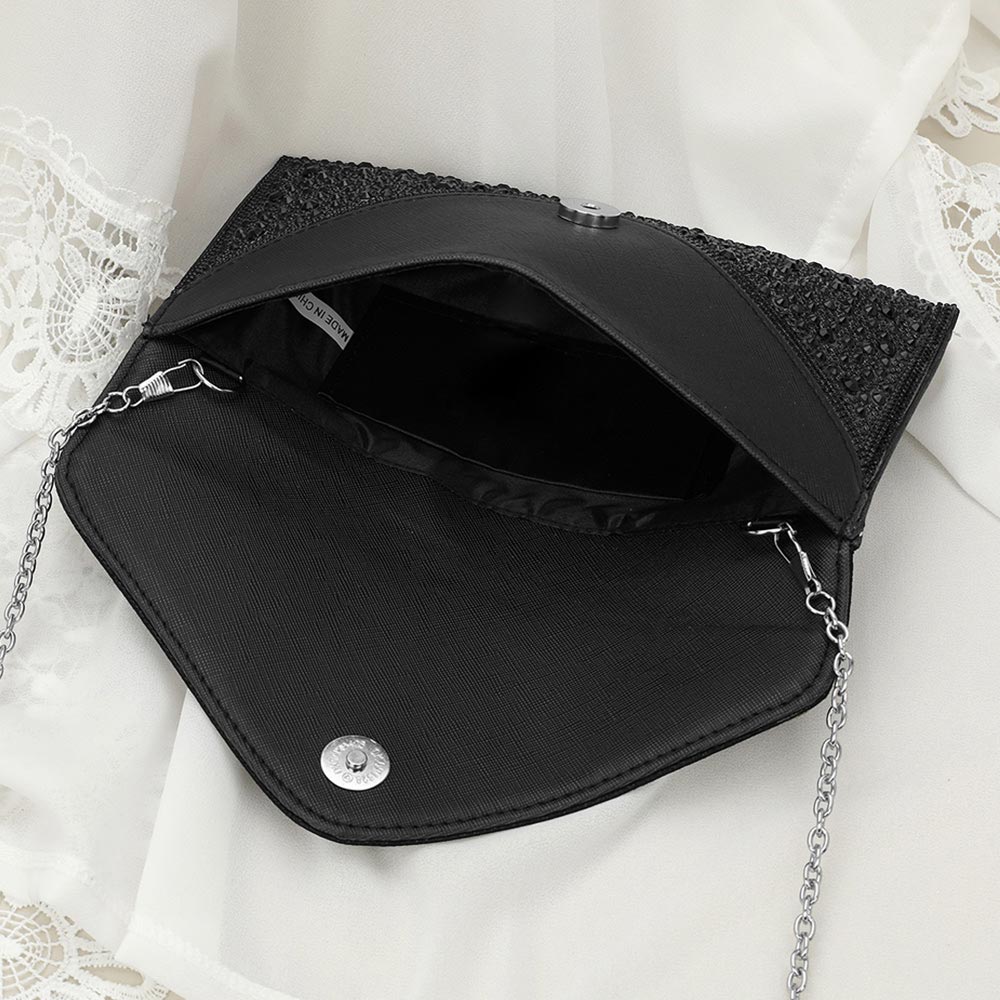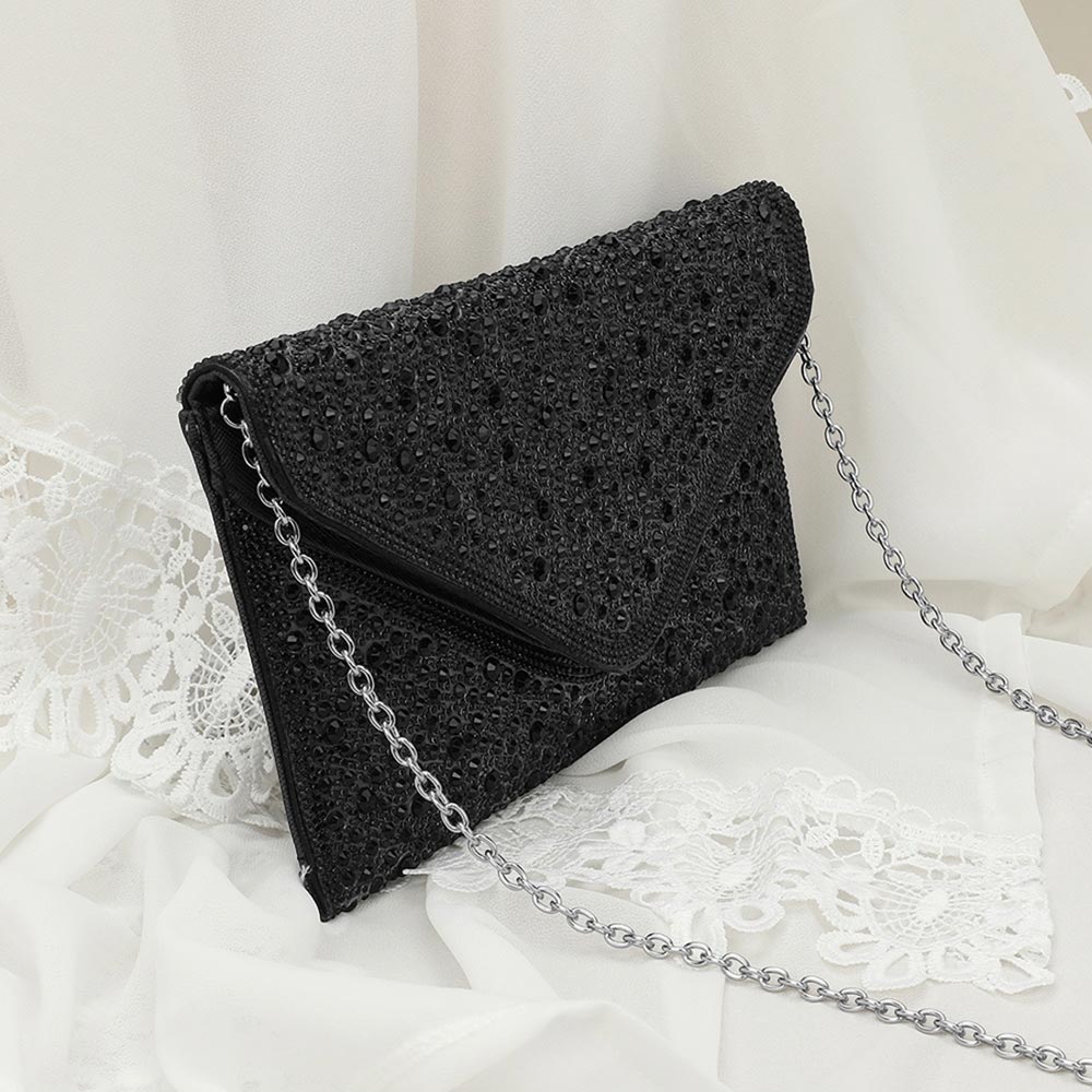Details • Size : 9" X 5" • Strap Size : 47" L / Detachable • One Inside Slip Pocket • Magnetic Closure • Elevate your formal attire with this glamorous envelope-style clutch, featuring dazzling embellishments and a sleek chain strap. Ideal for weddings, proms, or evening events, this refined accessory adds just the right amount of sparkle to any sophisticated look.