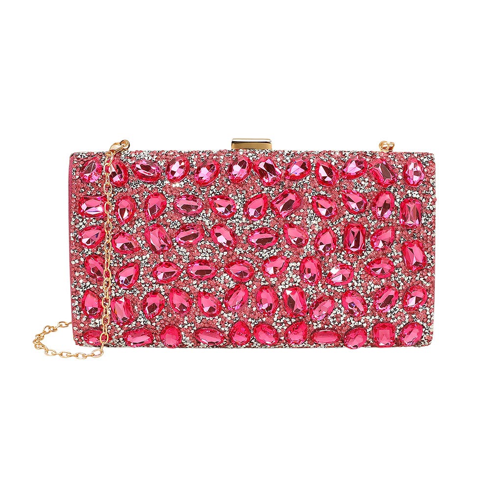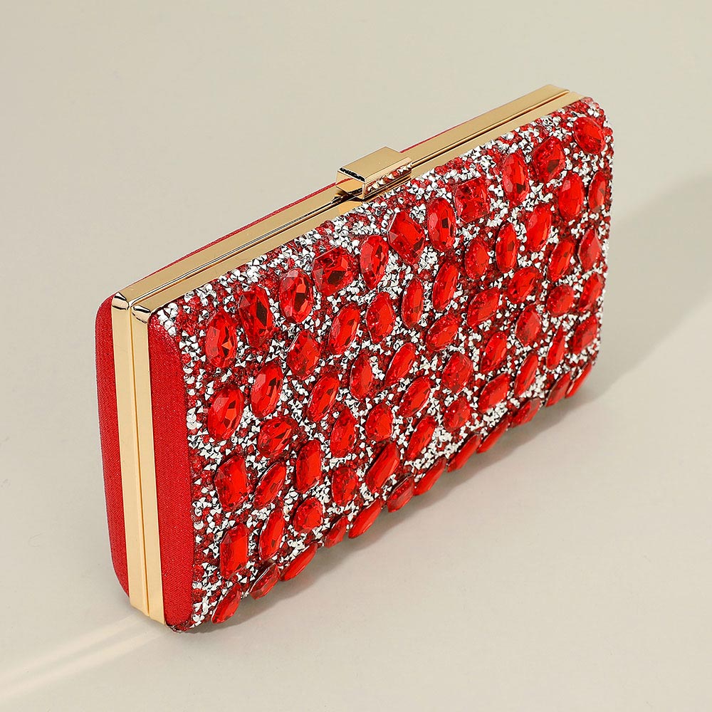 • Glamorous evening clutch adorned with sparkling stone accents for a statement look. Designed with a sleek silhouette and chain strap, this stylish accessory adds a touch of elegance to special occasions, parties, and night-out outfits.