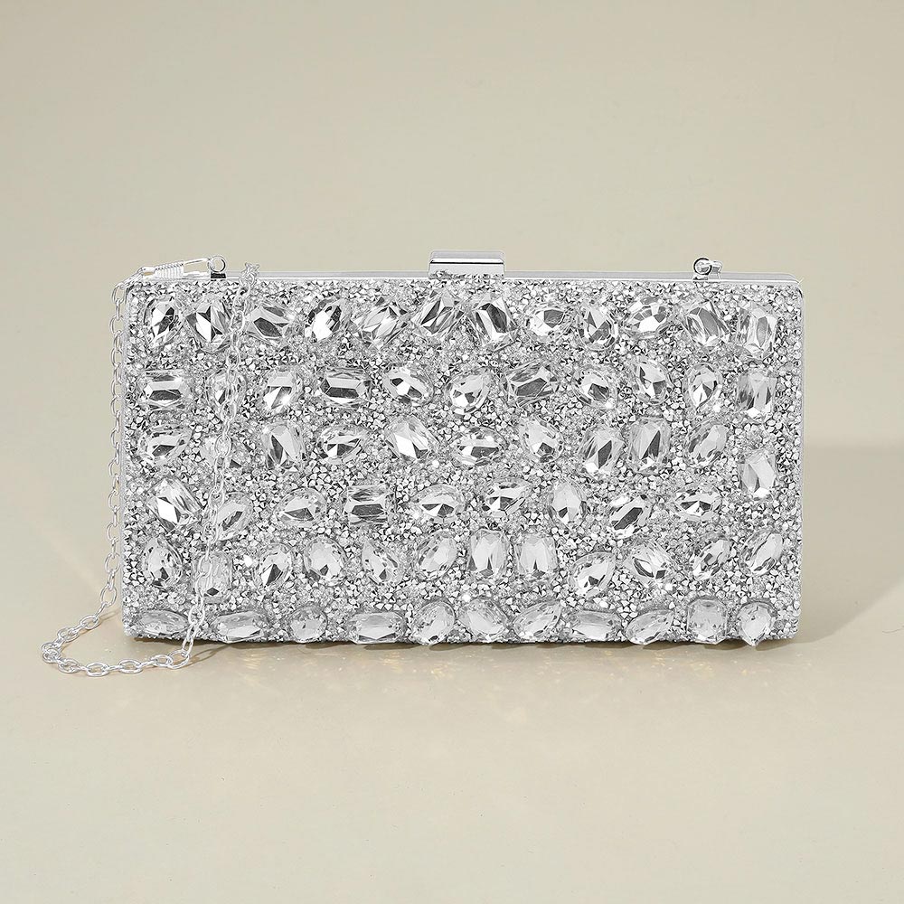 • Glamorous evening clutch adorned with sparkling stone accents for a statement look. Designed with a sleek silhouette and chain strap, this stylish accessory adds a touch of elegance to special occasions, parties, and night-out outfits.