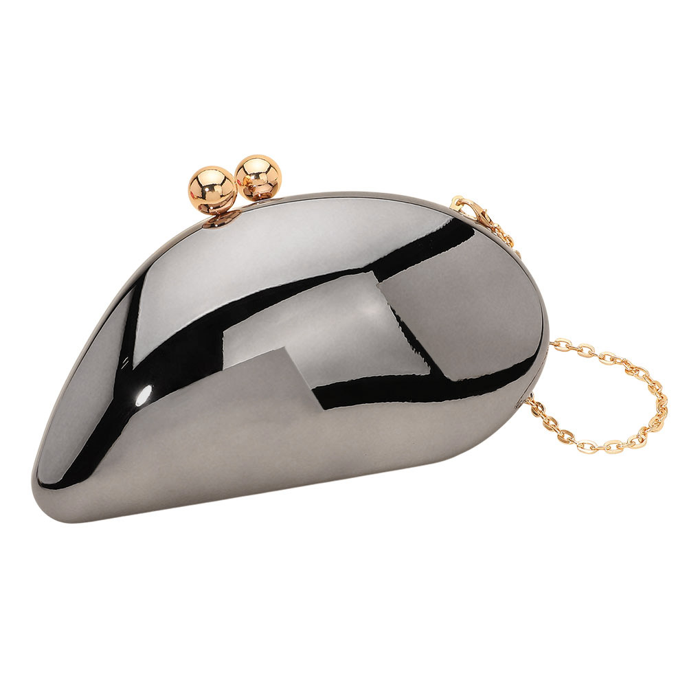 • Elevate any outfit with this modern teardrop-shaped evening clutch, designed with a smooth reflective finish and a chic chain strap. Its secure clasp closure and sculptural silhouette make it a standout accessory perfect for formal events, nights out, or special occasions.