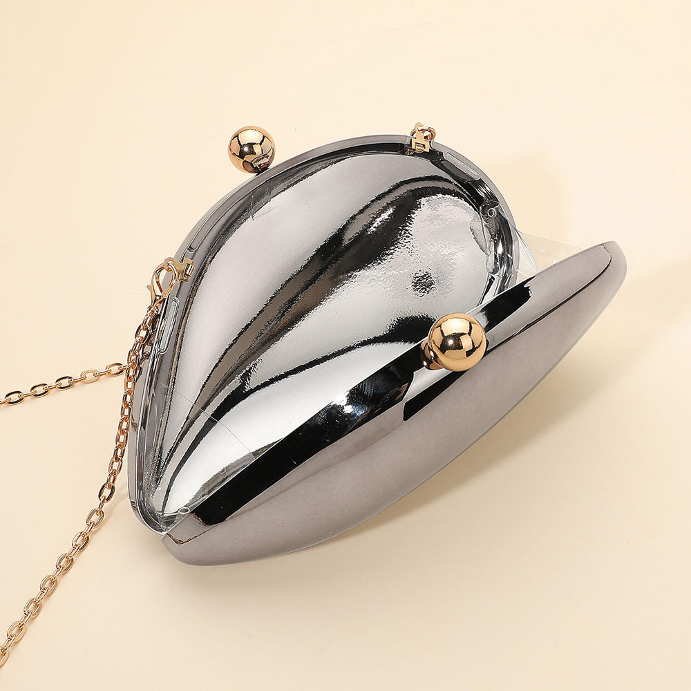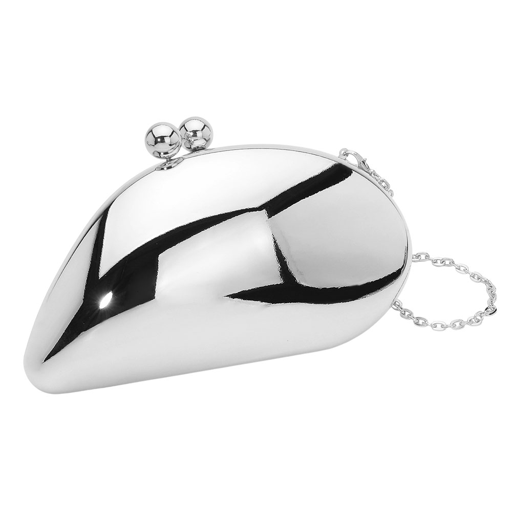 • Elevate any outfit with this modern teardrop-shaped evening clutch, designed with a smooth reflective finish and a chic chain strap. Its secure clasp closure and sculptural silhouette make it a standout accessory perfect for formal events, nights out, or special occasions.