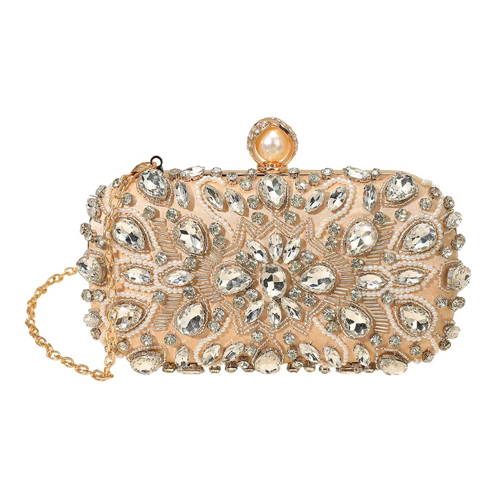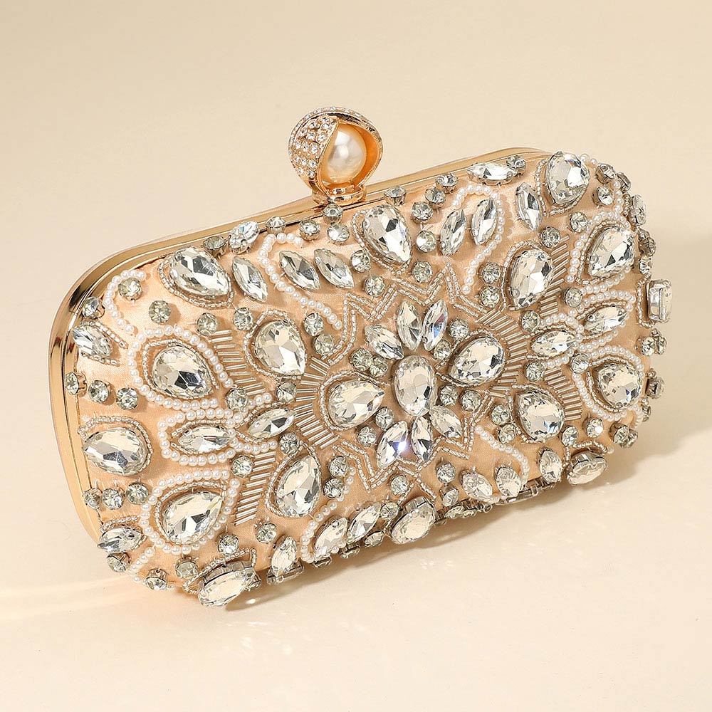 • This stunning evening clutch dazzles with intricate crystal embellishments and a luxurious pearl clasp for a sophisticated finish. Designed with a detachable chain strap, it’s ideal for weddings, galas, or special occasions, adding a radiant touch of glamour to any formal outfit.