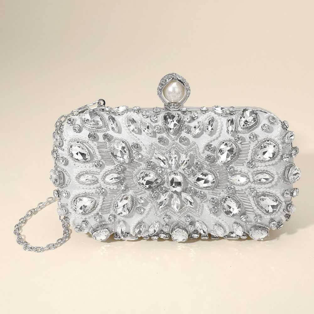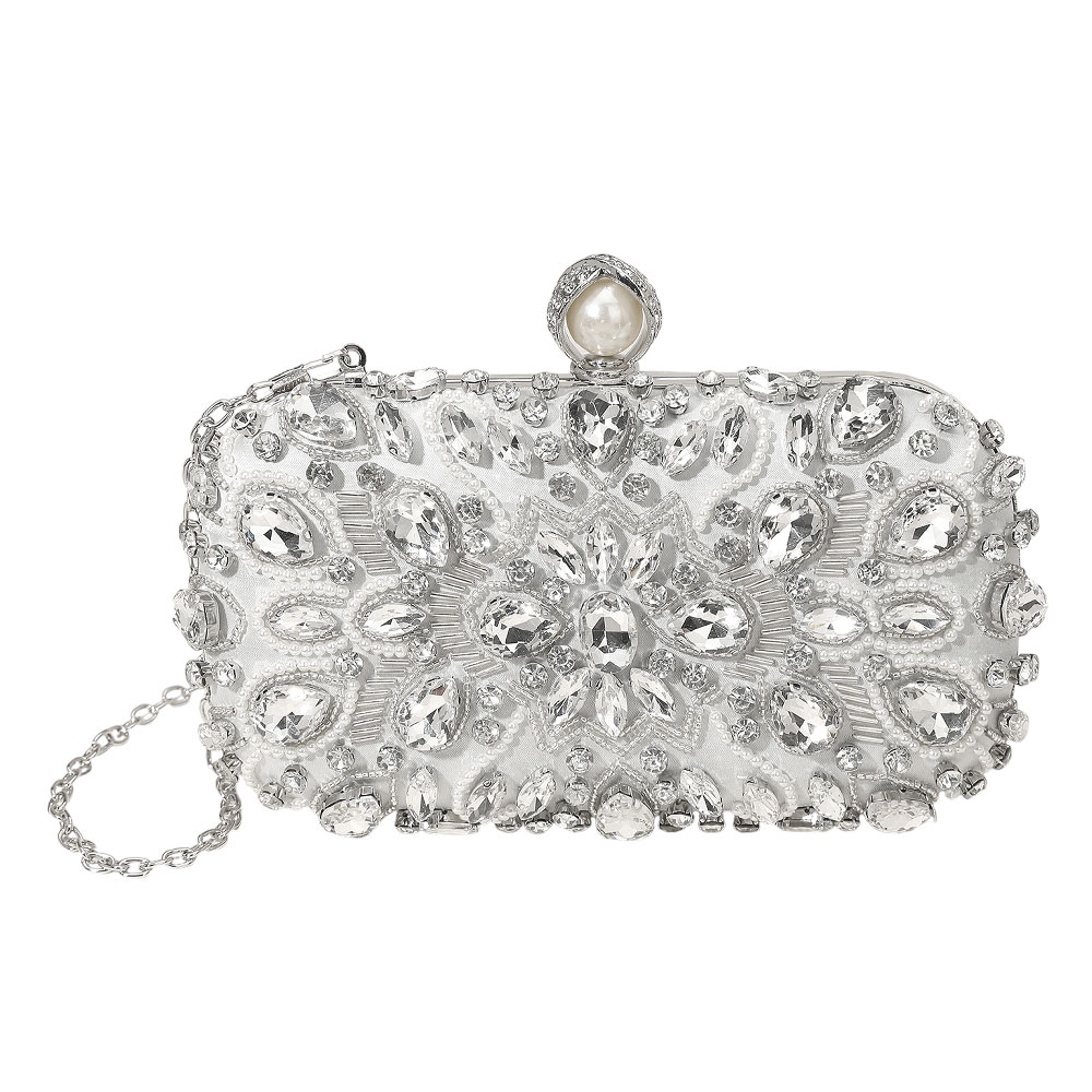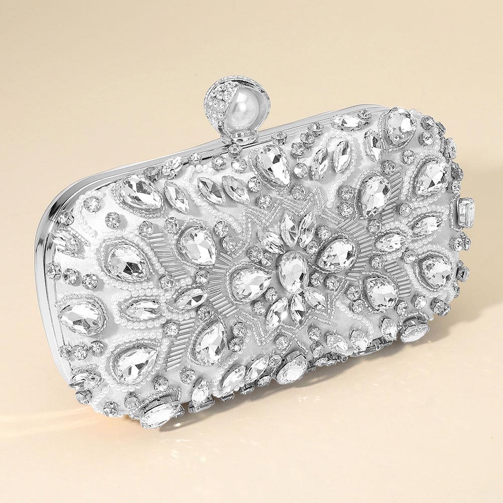 Details • Size : 7.75" X 5" X 2" • Strap 1 Size : 46" L / Detachable • Strap 2 Size : 15.5" L / Detachable • Clasp Closure • This stunning evening clutch dazzles with intricate crystal embellishments and a luxurious pearl clasp for a sophisticated finish. Designed with a detachable chain strap, it’s ideal for weddings, galas, or special occasions, adding a radiant touch of glamour to any formal outfit.
