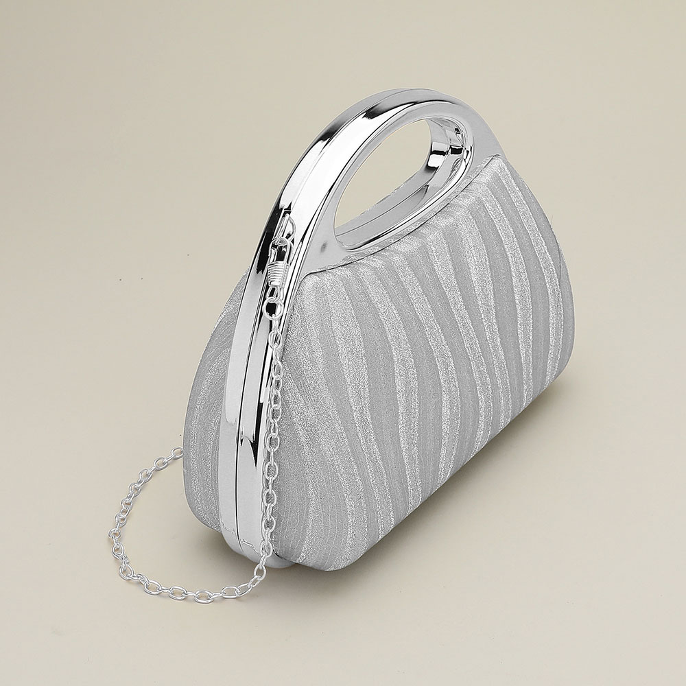 Details • Size : 8.5" X 6.5" X 3" • Top Handle Size : 2" L • Strap Size : 46"L • Clasp Closure • A refined evening handbag featuring a sculpted silhouette, metallic handle, and shimmering textured body. Designed for formal events, it offers a polished finish and a detachable chain for versatile styling, keeping essentials organized while enhancing any sophisticated look.
