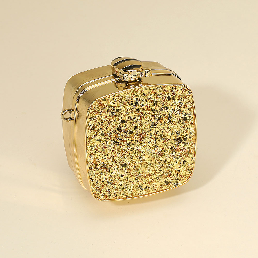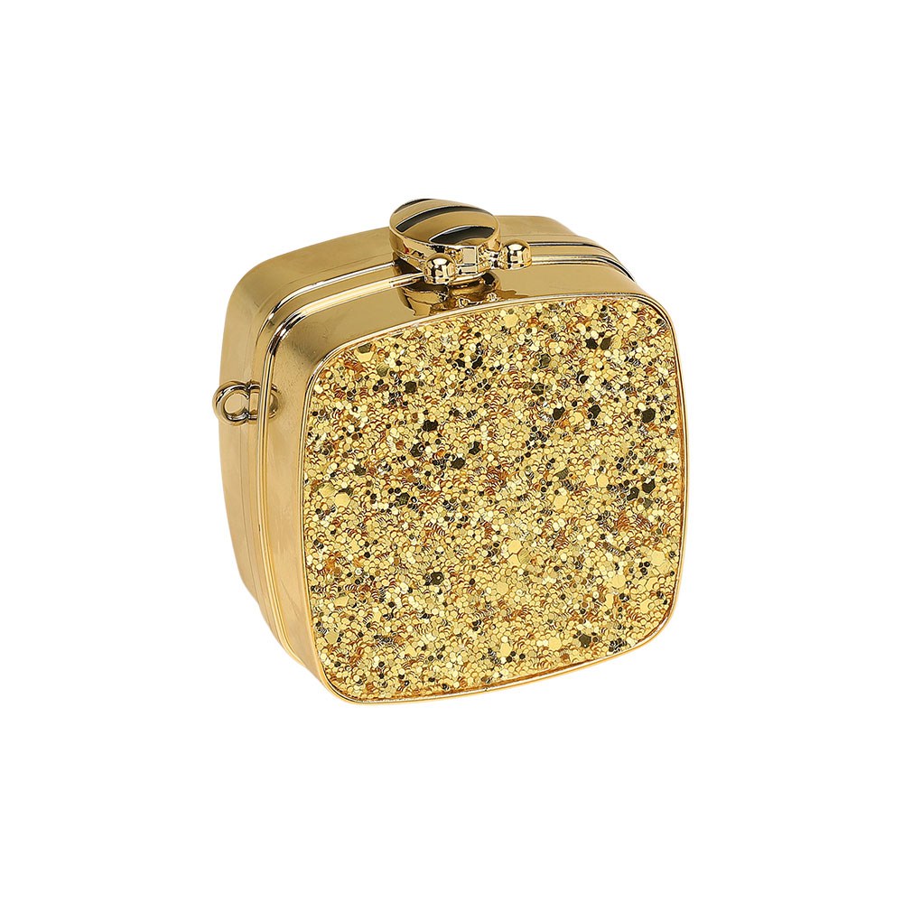 • Dazzle at parties with this square glitter mini clutch in gold. Features a sparkling exterior, secure clasp, and an interior mirror for touch-ups on the go. Compact yet stylish, it includes a detachable chain strap, making it perfect for weddings, nights out, and special occasions.