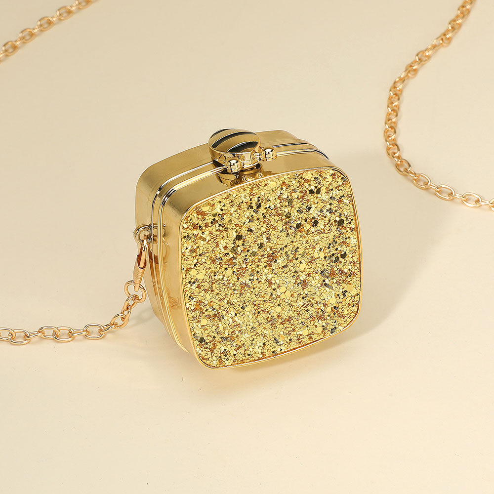 • Dazzle at parties with this square glitter mini clutch in gold. Features a sparkling exterior, secure clasp, and an interior mirror for touch-ups on the go. Compact yet stylish, it includes a detachable chain strap, making it perfect for weddings, nights out, and special occasions.