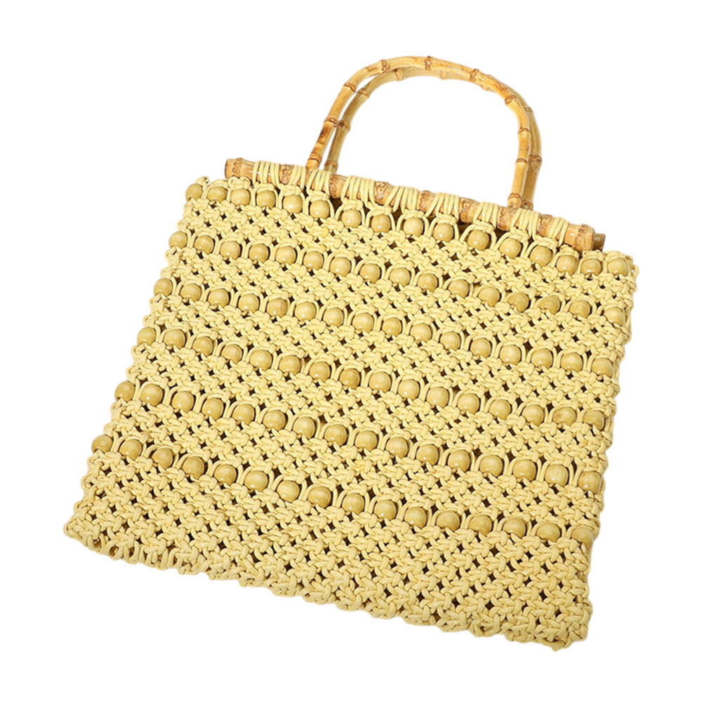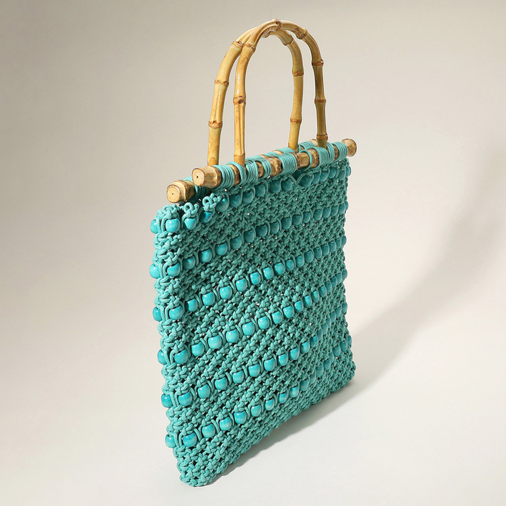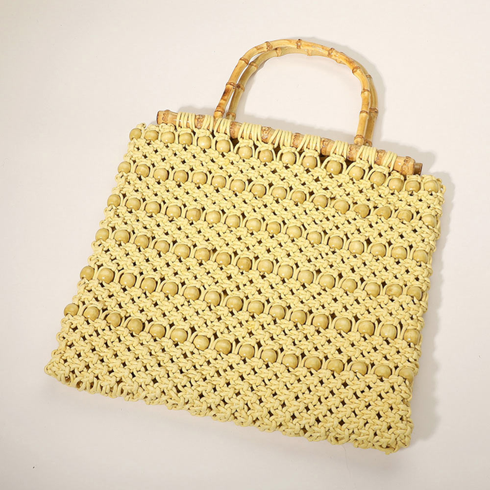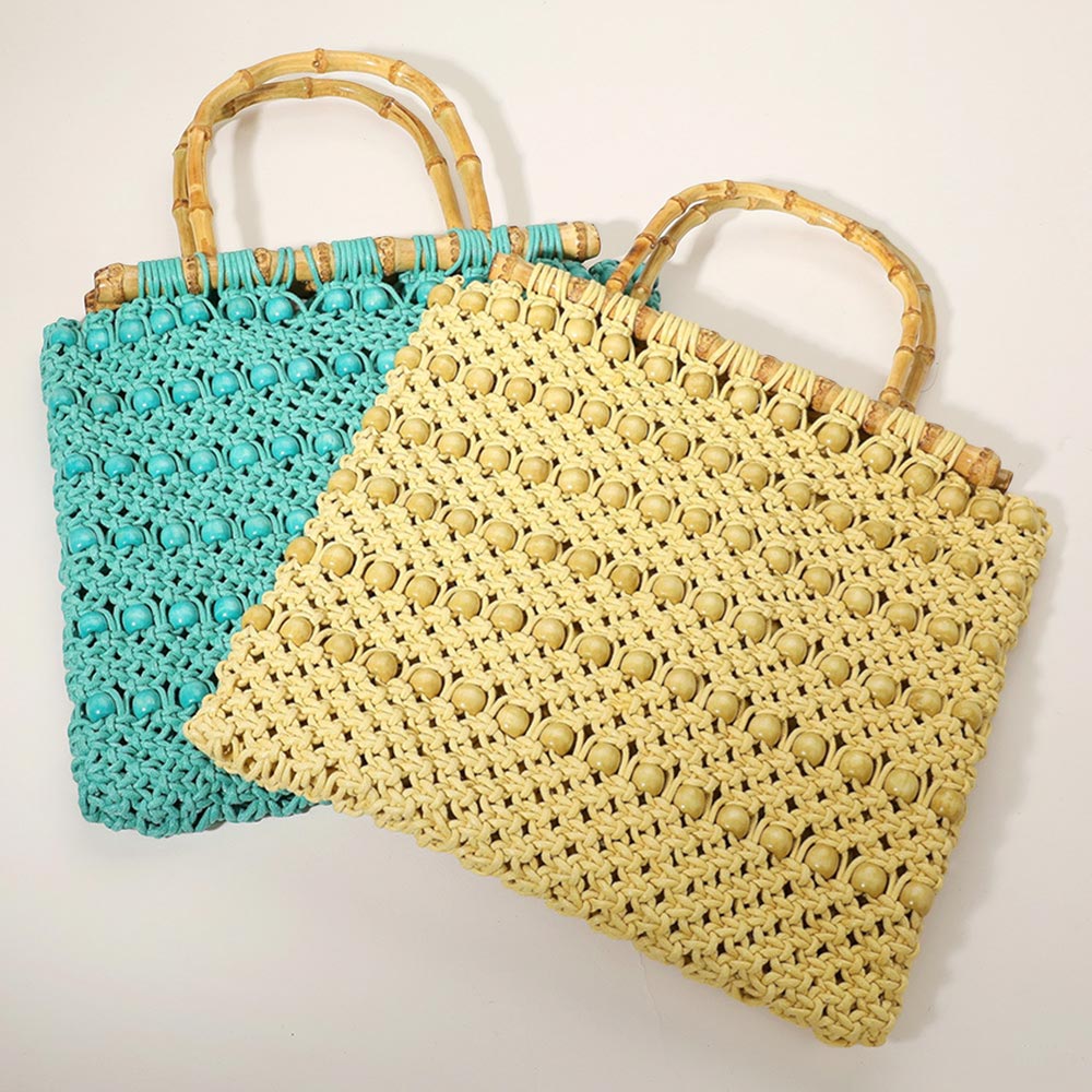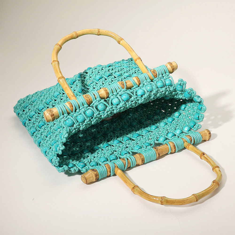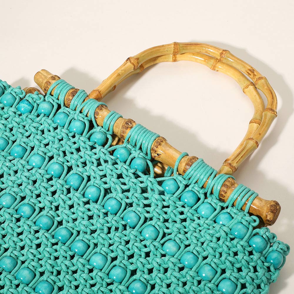 Bamboo Handle Wooden Ball Embroidered Crochet Tote Bag