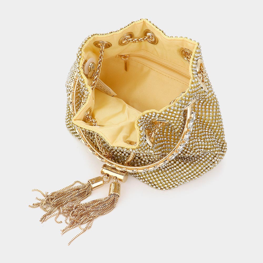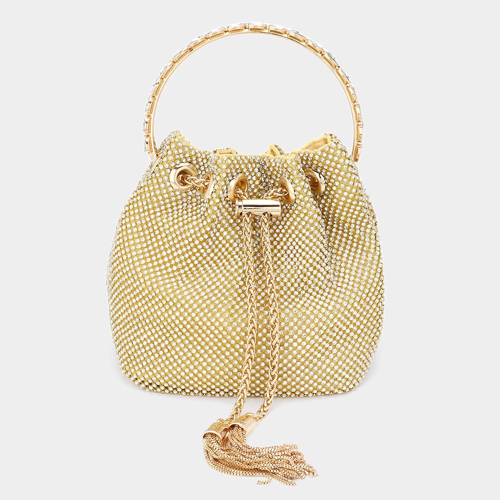 Bling Rhinestone Mesh Metal Draw String with Glass Stone Embellished Top Handle Bucket Bag / Crossbody Bag