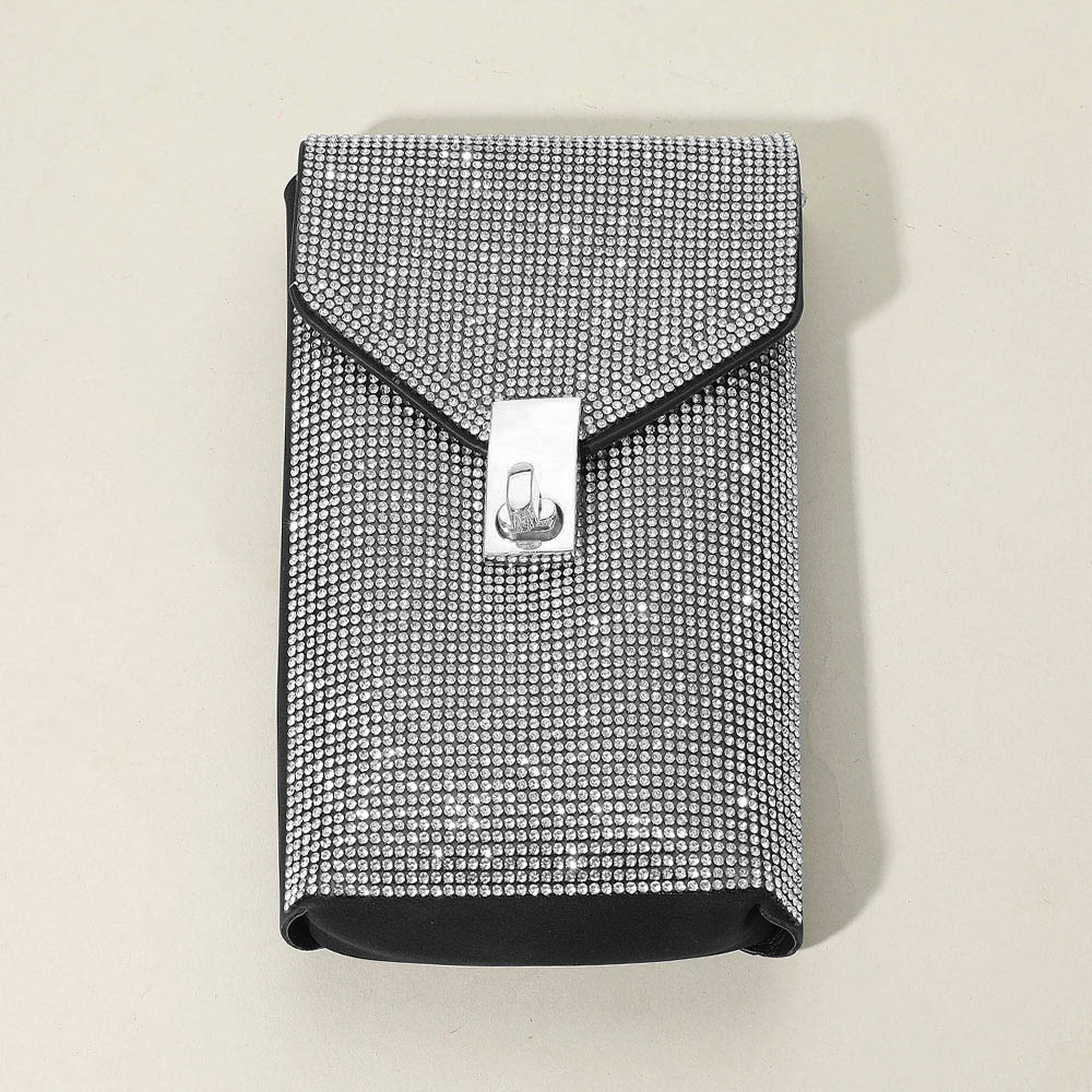 Details • Bag Size : 4" X 7" • Chain Strap Size : 20" L • No Inside Pocket • Turn Lock Closure • Compact crossbody bag featuring a glittering rhinestone exterior, gold-tone chain strap, and secure front lock closure—perfect for evening events or casual outings.