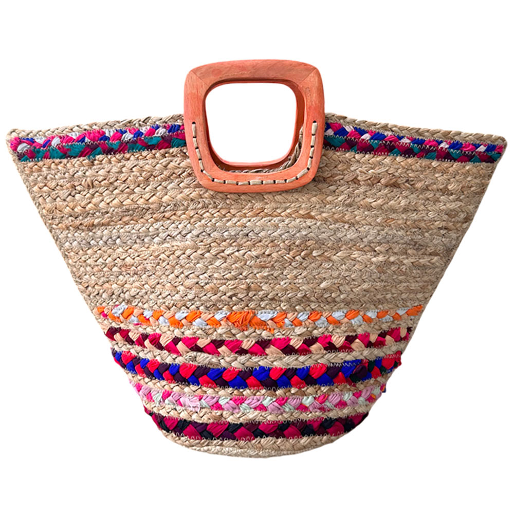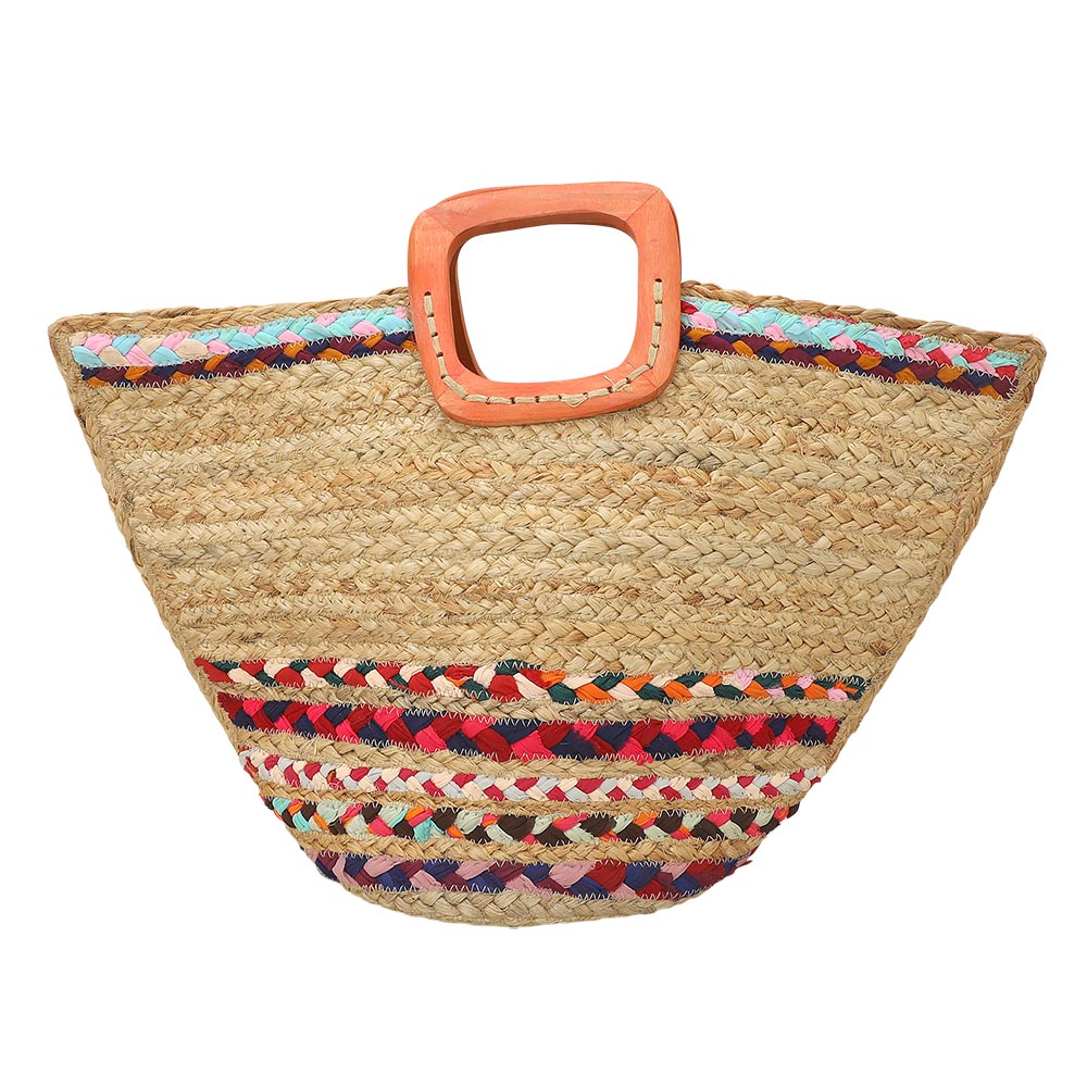 Details • Size : 19.5" X 11.5" X 7.75" • Top Handle Size : 5" L • Spacious woven tote bag designed with braided accent detailing and a structured top handle for easy everyday carry. Roomy interior fits daily essentials while the bold patterned design adds visual interest. Ideal for shopping, travel, beach days, or boutique collections seeking statement-making, functional accessories. • Made In India