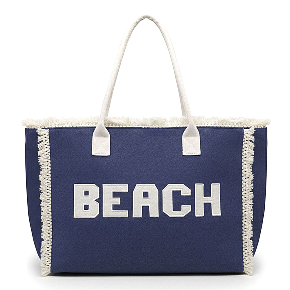 Details • Size : 17.5" X 14" X 5" • Inner Pocket • Zipper Closure • Material : 100% Polyester • Statement oversized tote bag with bold BEACH lettering, perfect for travel, vacations, pool days, and everyday carry. Open interior fits towels, clothing, and essentials with ease. Comfortable shoulder straps make it ideal for resorts, boutiques, and seasonal displays.