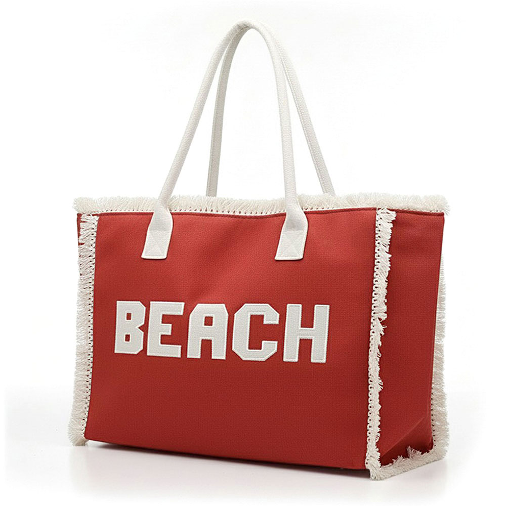 Bold BEACH Letter Embroidered Fringe Tote Bag
