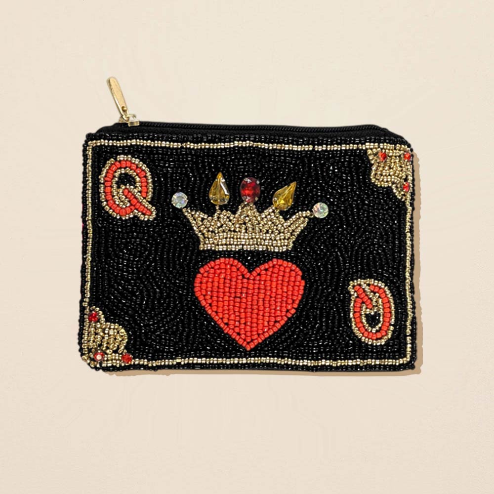 Details • Size : 5" X 3.75" • No Inside Pocket • Beads On Front Only • Zipper Closure • This beaded zip pouch showcases a crowned heart motif with decorative accents for a bold, playful look. Designed to store coins, cards, keys, or small essentials, it offers compact organization with standout detail. Ideal for gifting, Valentine’s Day displays, or boutique accessory assortments, it adds charm and personality to everyday carry while remaining easy to style and merchandise. • Made In India