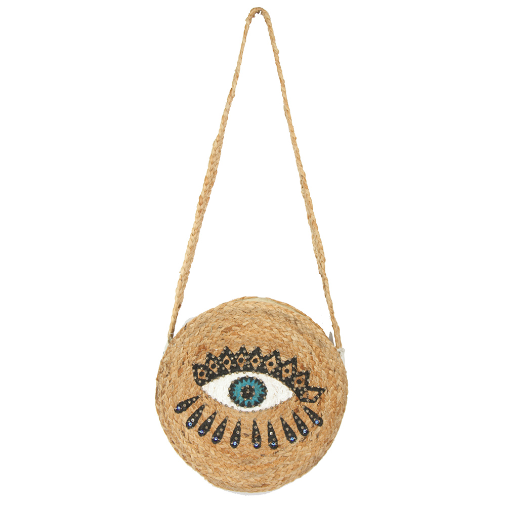 Details • Size : 13" X 13" X 3.25" • Strap Size : 18.5" L • Two Inside Slip Pockets • Zipper Closure • Statement round shoulder bag designed with a bold evil eye motif and detailed embellishment for standout everyday style. Compact yet functional interior holds daily essentials with ease. Lightweight and easy to carry, ideal for vacations, festivals, and boutiques seeking trend-forward, eye-catching accessories. • Made In India