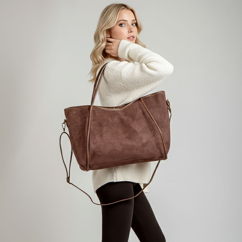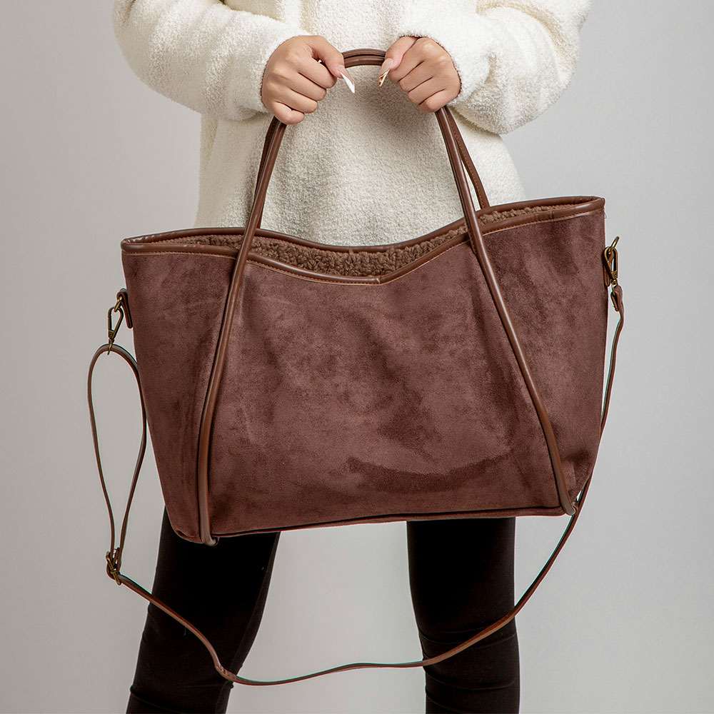 • This suede-style tote bag blends elegance with practicality, featuring dual handles for easy carrying and a roomy interior to keep essentials organized. A versatile design that transitions seamlessly from work to casual outings while adding a touch of sophistication.