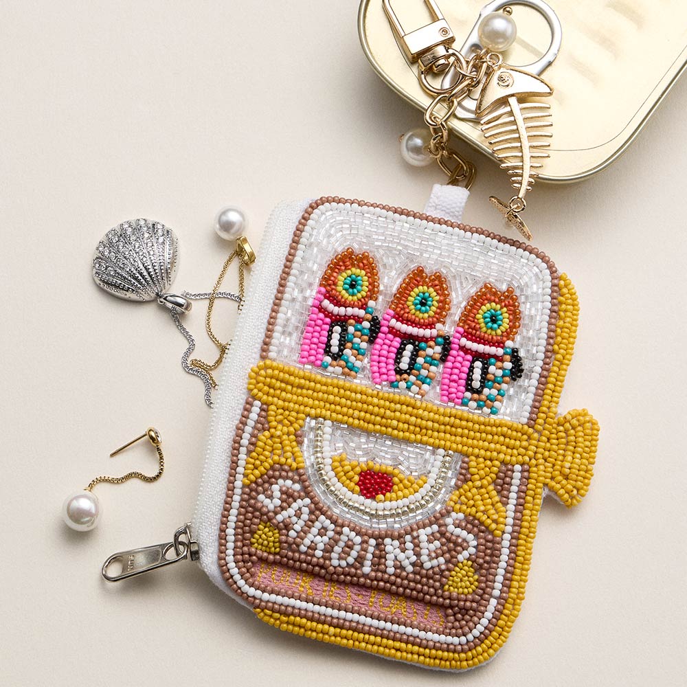 Details • Size : 3.75" X 4" (appx), 5" L • No Inside Pocket • Beads On Front Only • Bag Only (items are not included) • Zipper Closure • Playful sardines themed beaded zipper pouch with attached keychain clip, designed to hold coins, cash, cards, earbuds, or small daily essentials. Compact novelty accessory for handbags, backpacks, gift shops, beach collections, and eye catching impulse buy displays. • Made In India