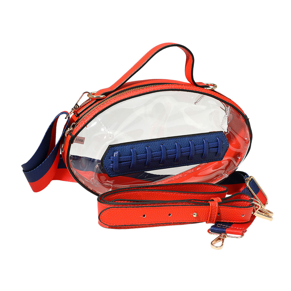 Details • Size : 10.75" X 5" X 5" X 2.6" • Top Handle Size : 2.25" L • Strap 1 Size : 36" L / Detachable, Adjustable • Strap 2 Size : 49" L / Detachable, Adjustable • Oval clear crossbody bag with wide adjustable strap, zip closure, and bold front accent detail. Lightweight and stadium-approved, this stylish accessory blends fashion and function for everyday or event use.