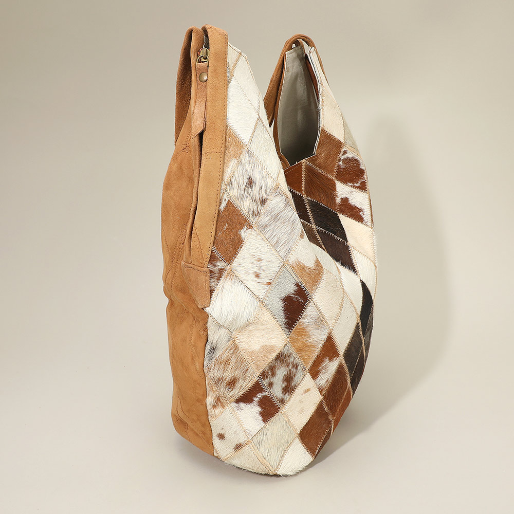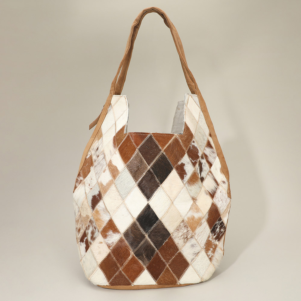 Details • Size : 16" X 15" X 6.5" • Shoulder Strap Size : 10" L • One Inside Zipper Pocket • Magnetic Closure • Eye-catching shoulder bag featuring a geometric diamond patchwork pattern for a unique textured look. The slouchy rectangular body and wide, soft handles provide comfort and style, making it ideal for daily use or as a standout accessory for casual outings.