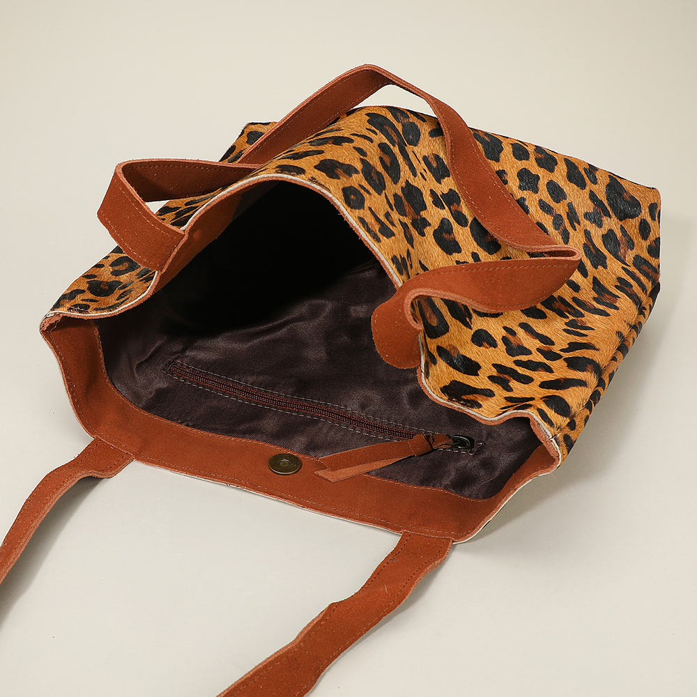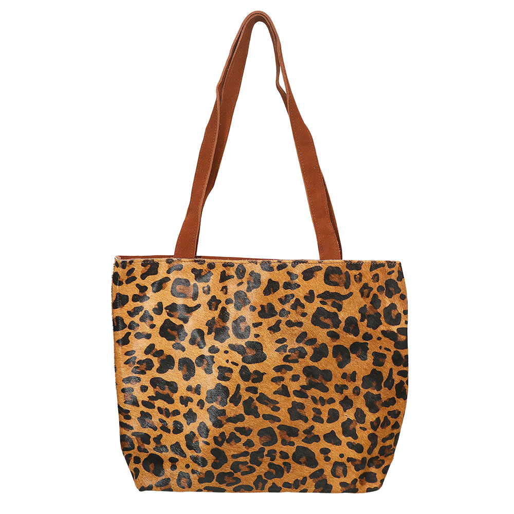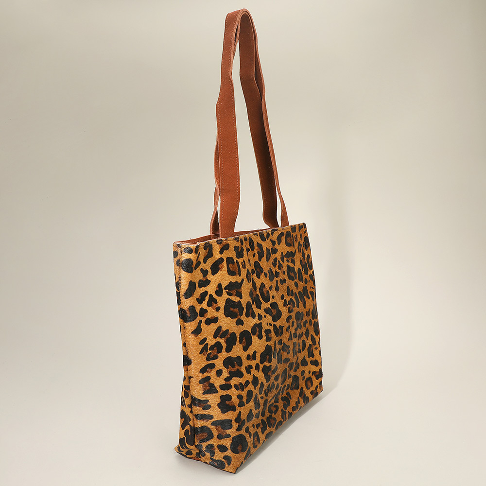 Details • Size : 15.25" X 12" X 3.5" • Shoulder Strap Size : 12" L • One Inside Zipper Pocket • Magnetic Closure • Chic tote bag featuring a bold leopard pattern and sturdy dual handles. Designed in a classic rectangular shape, this spacious carryall combines fashion and function, perfect for everyday errands, shopping, or adding a statement accent to casual outfits.