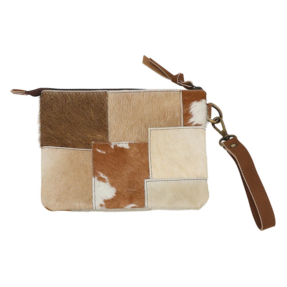 Details • Size : 8.75" X 7" • Wristlet Size : 8" L • Zipper Closure • Stylish cowhide wristlet pouch clutch with patchwork front, secure zip closure, and detachable strap. Compact yet spacious enough for phone, keys, and daily essentials. Perfect for travel, errands, or organizing items inside larger bags with a chic, functional touch. • Made In India