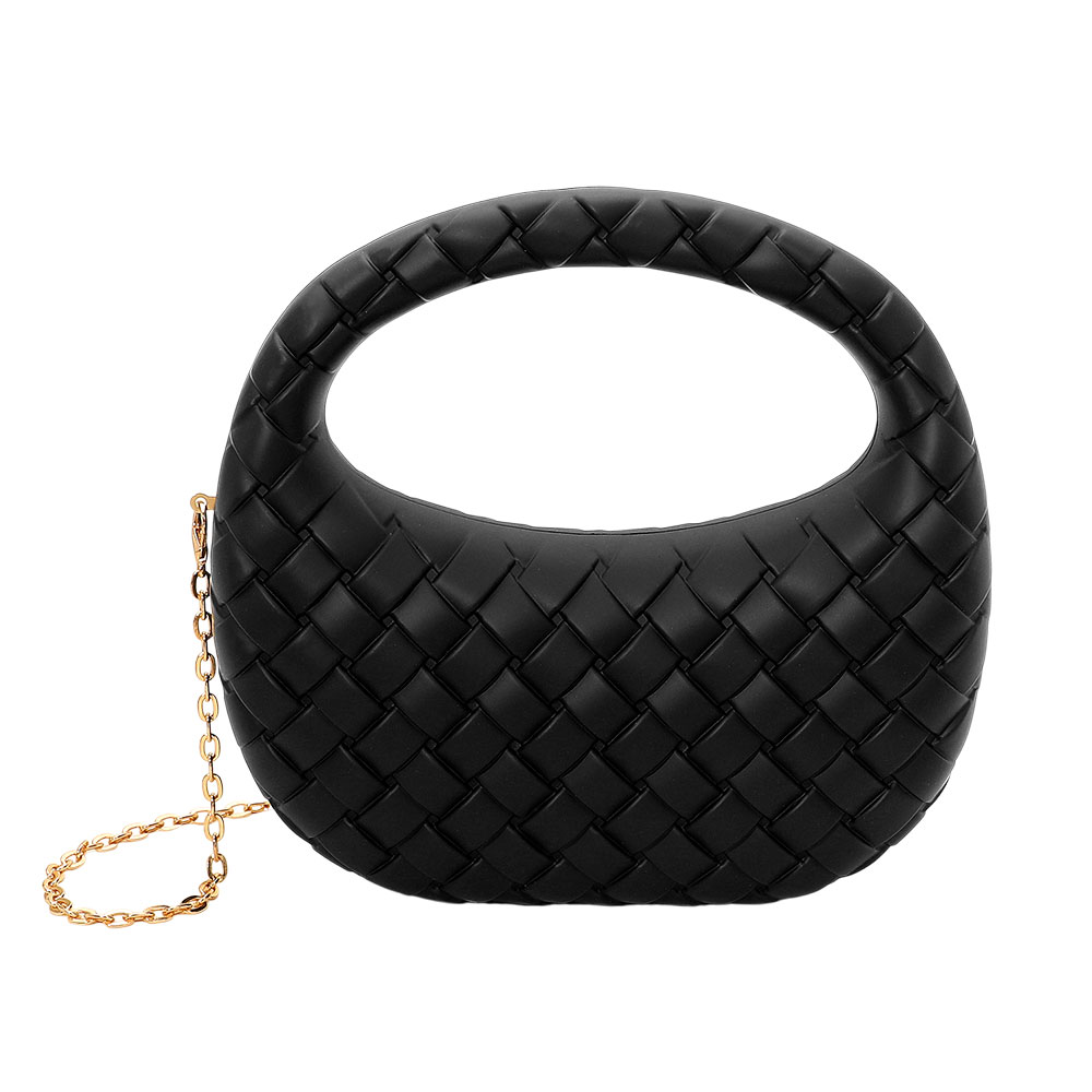• A stylish woven-pattern evening clutch designed with a sculpted handle and a sleek silhouette. The compact shape offers modern sophistication, while the detachable chain strap adds versatile wear for special events, nights out, and elegant occasions.