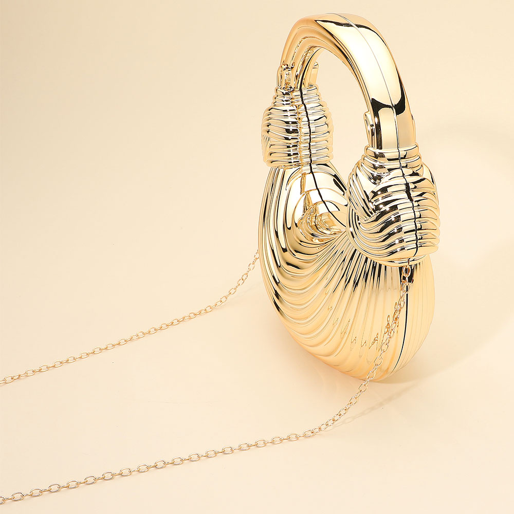 • This sculpted fashion bag features a distinctive loop-handle silhouette with layered, curved ridges that create a bold, fluid shape. A sleek chained detail adds versatility, making it an expressive accessory that elevates evening outfits and modern, statement-driven looks.