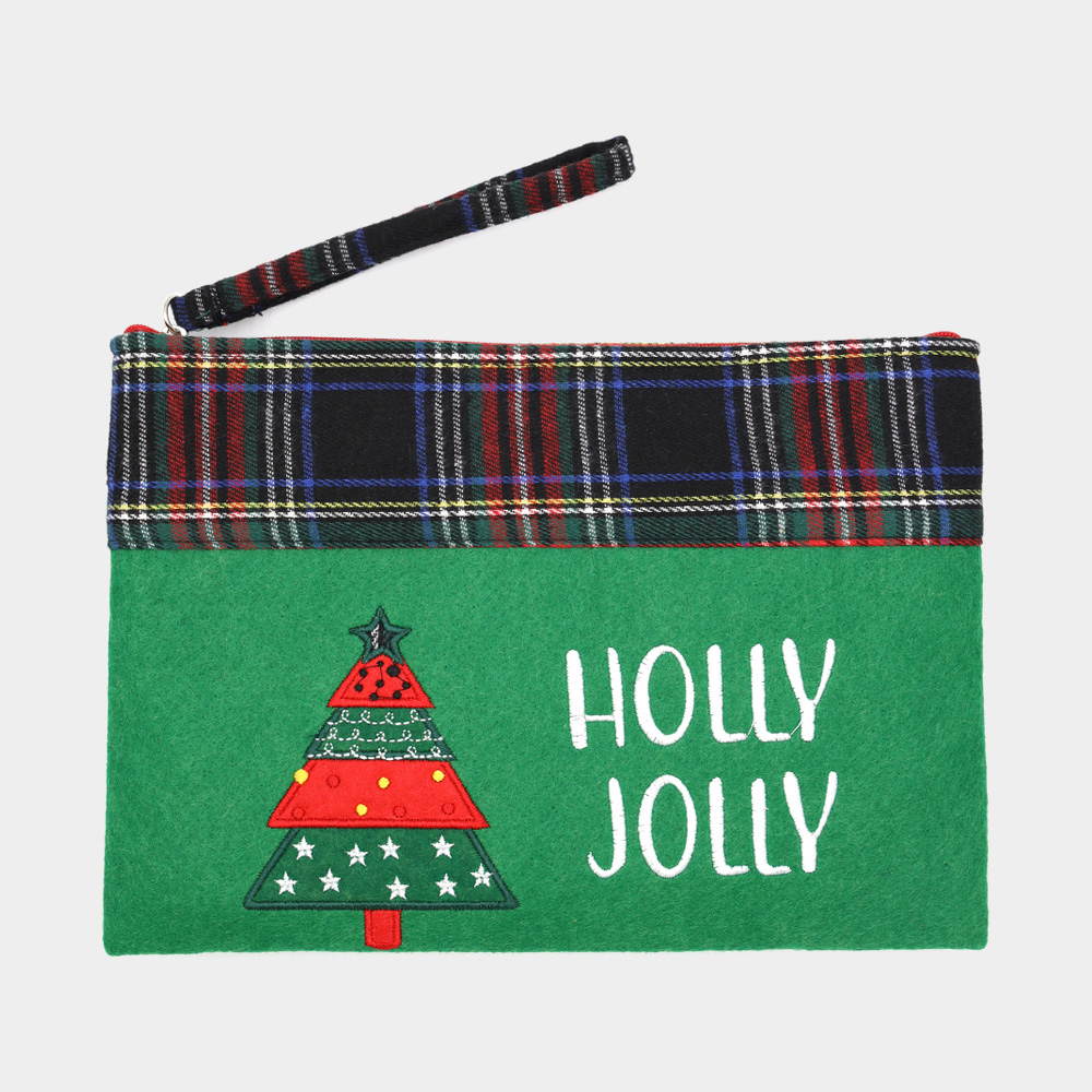 Details • Size : 10" X 7" • Zipper Closure • Material: 100% Polyester • Zipper Closure • Add a touch of holiday joy with this “HOLLY JOLLY” pouch, featuring a festive Christmas tree and plaid trim. Perfect for holding small gifts, cosmetics, or travel items during the season. A merry little essential to keep your holiday organized and cheerful.