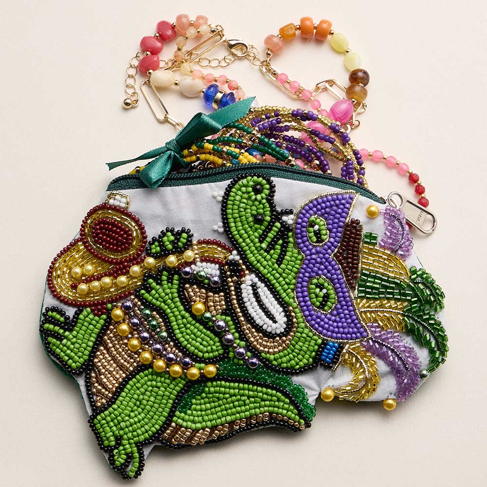 Details • Size : 4.25" X 5.5" (appx) • No Inside Pocket • Beads On Front Only • Bag Only (items are not included) • Zipper Closure • Festive zipper pouch featuring a playful alligator character inspired by Mardi Gras celebration themes. Designed for storing cosmetics, coins, keys, or small accessories, this novelty pouch adds fun personality to seasonal collections, party assortments, gift shops, and festival-focused retail displays while offering practical everyday organization. • Made In India