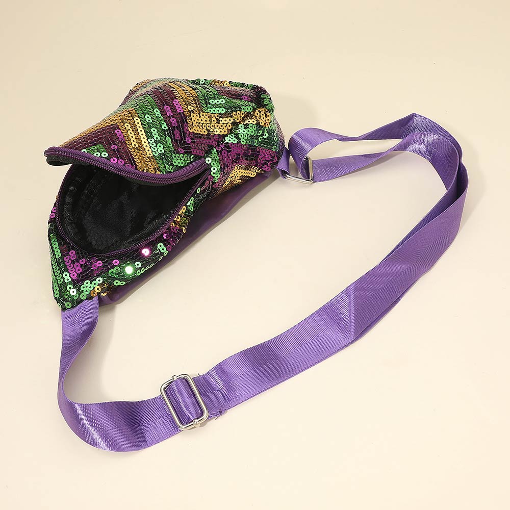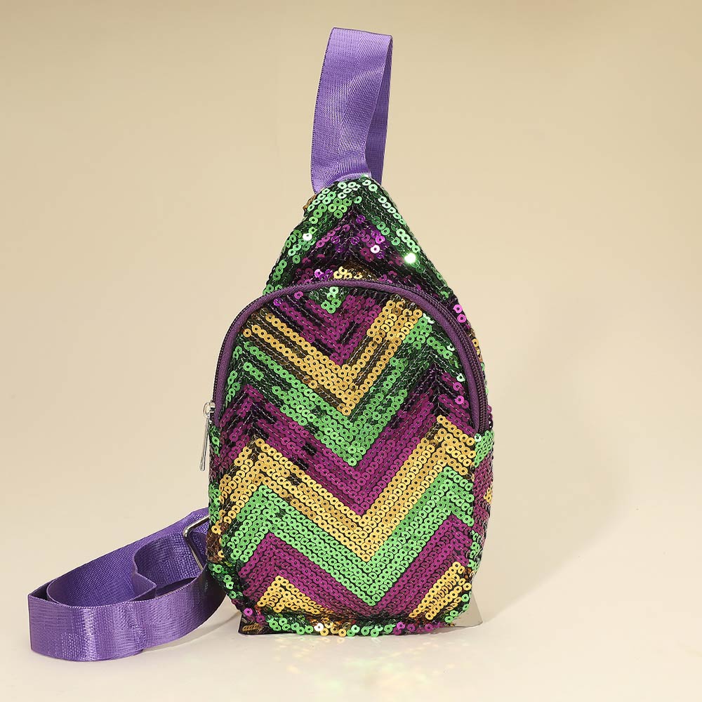 Details • Size : 6.25" X 11.25" X 3.2" • Strap Size : Adjustable • Zipper Closure • Statement chevron sequin sling backpack designed for festivals, themed events, travel, and hands free everyday use. Features a secure zipper closure, adjustable strap, and compact yet functional interior for essentials. A strong boutique option for seasonal promotions, party displays, and customers seeking bold fashion accessories with practical wearability.