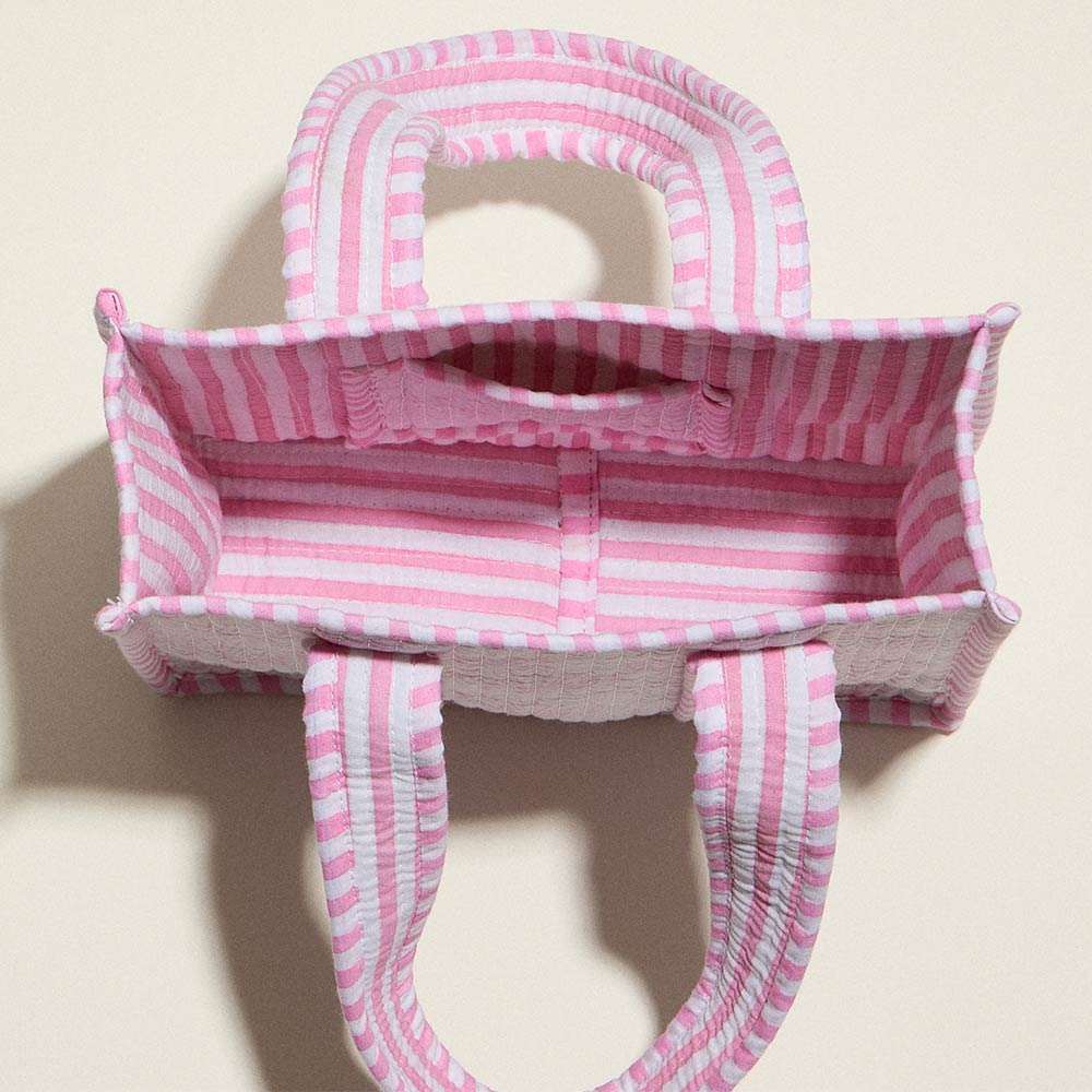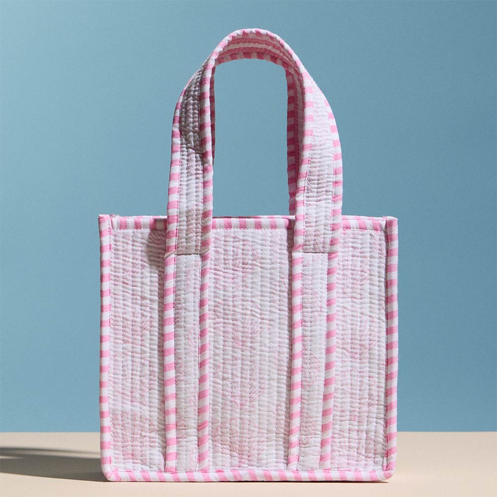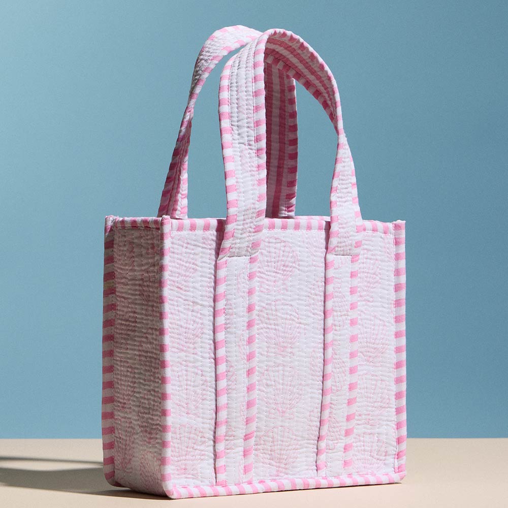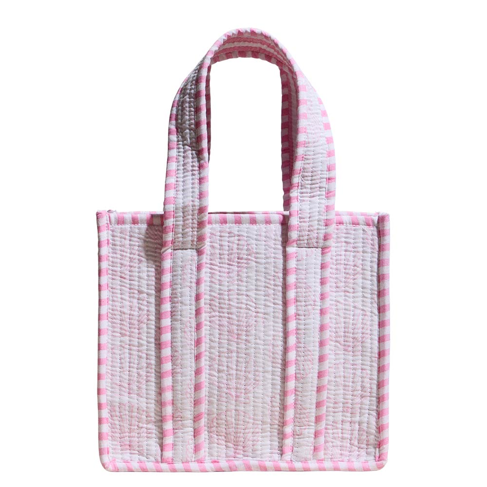 Details • Size : 8.5" X 8.5" X 2.5" • Top Handle Size : 5.5" L • One Inside Slip Pocket • Quilted shell patterned tote bag designed for everyday use, shopping, travel, and casual outings. Features a structured shape with comfortable handles and a roomy interior for essentials, making it ideal for work, errands, gifting, seasonal collections, and lifestyle accessory displays with a clean and versatile design.