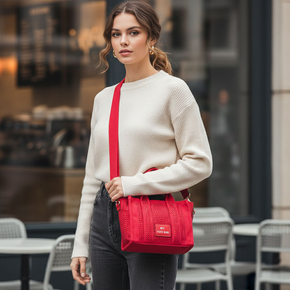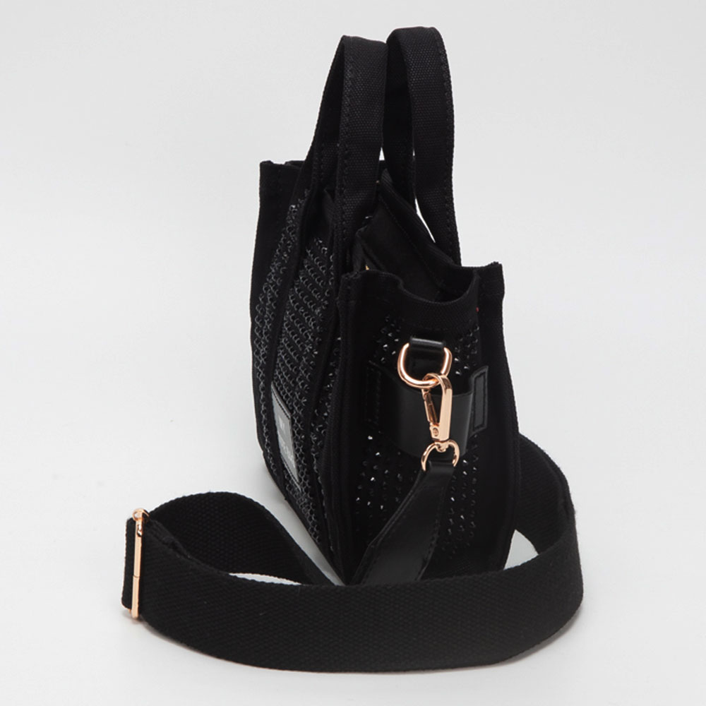 Details • Size : 8" X 6" X 3" • Top Handle Size : 3" L • Strap Size : 54" L / Adjustable, Detachable • Zipper Closure • Stylish small tote bag featuring a structured silhouette accented with sparkling embellishments for eye-catching appeal. Designed with top handles and an adjustable strap, this compact bag is perfect for carrying small essentials while adding a playful, fashion-forward touch to everyday looks and boutique collections.