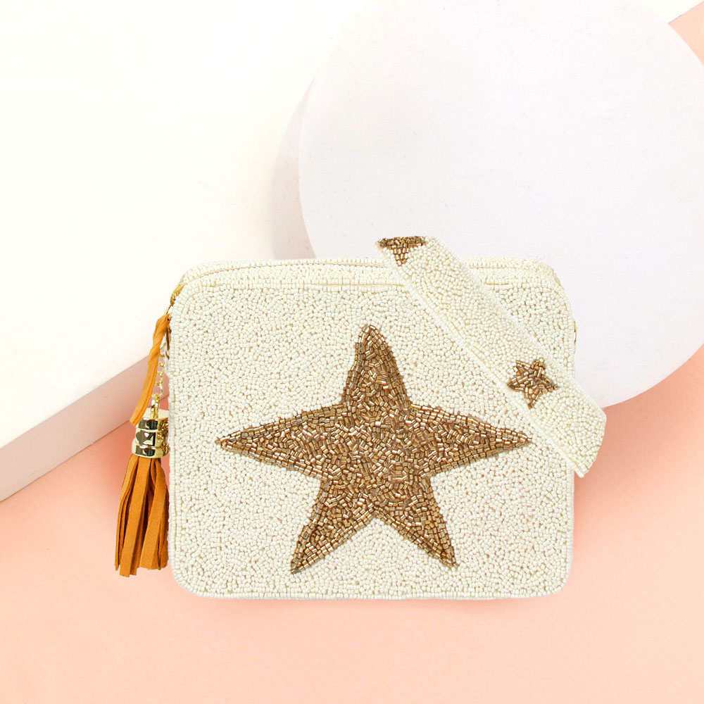Rainbow Color Block Seed Beaded Star Accented Rectangle Tassel Crossbody Bag