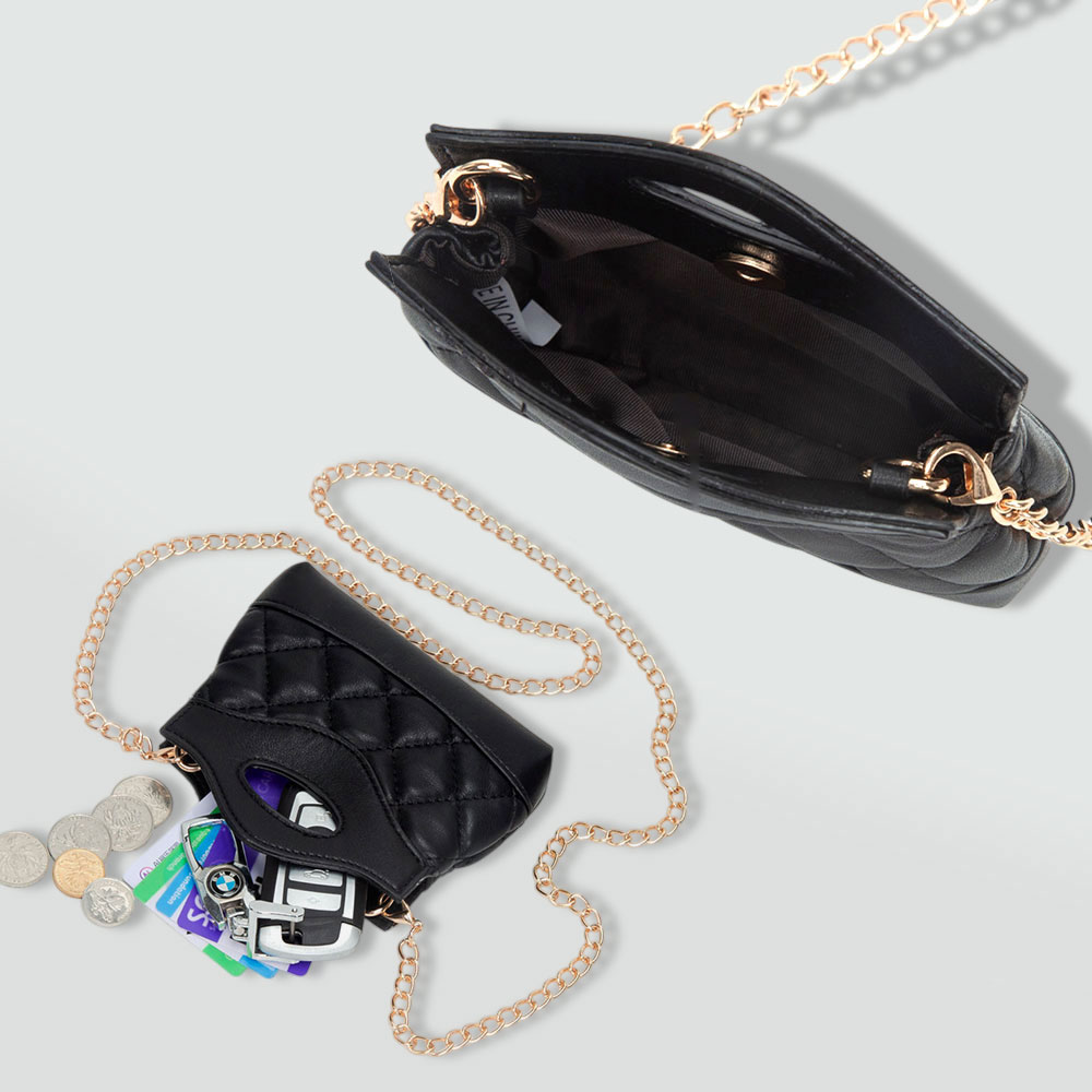 • Stay stylish and organized with this mini quilted crossbody bag featuring a sleek chain strap and unique cutout handle. Perfect for carrying essentials like cards, keys, and small items, it offers trendy convenience for outings, travel, and everyday use while adding a chic touch to any look.